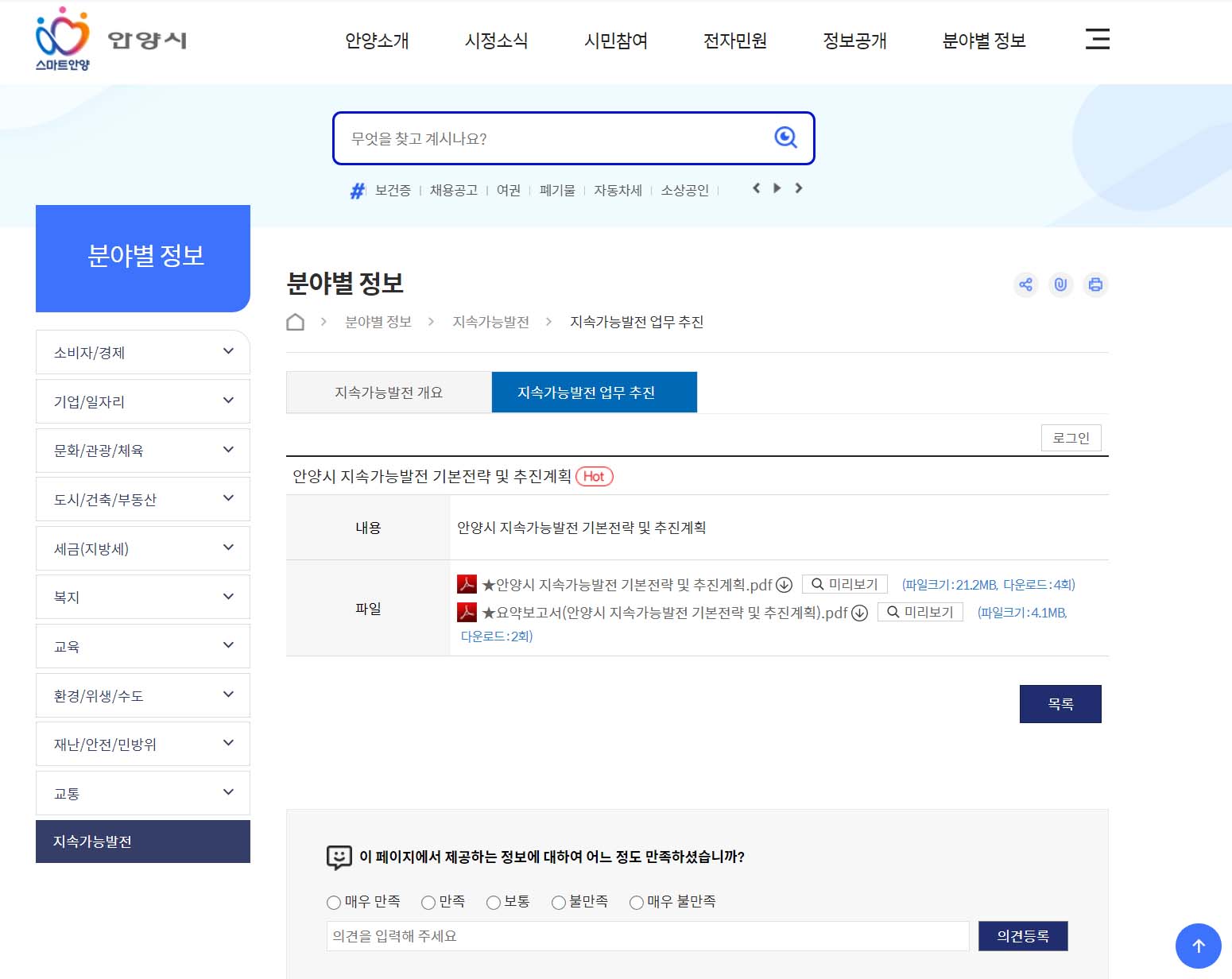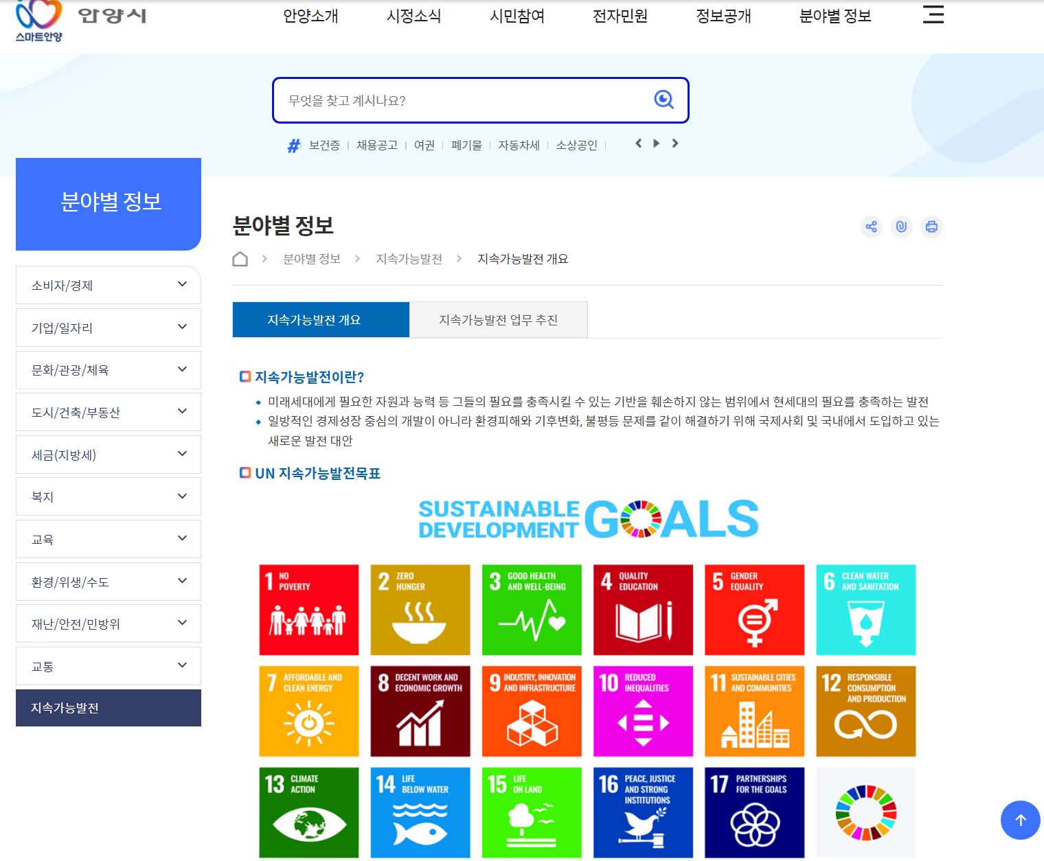 안양시홈페이지 분야별정보에 <지속가능발전> 웹페이지가 신설됐다.