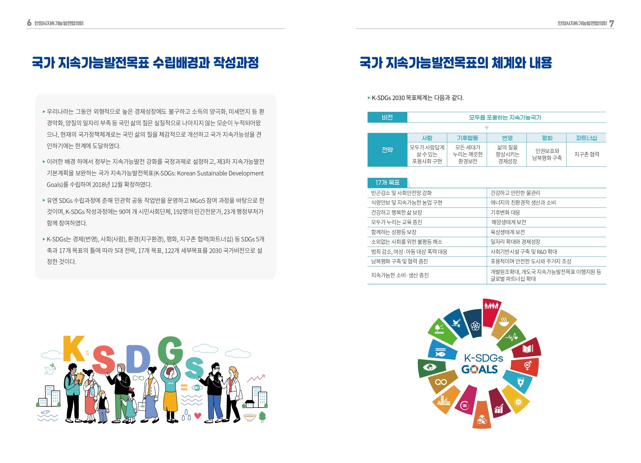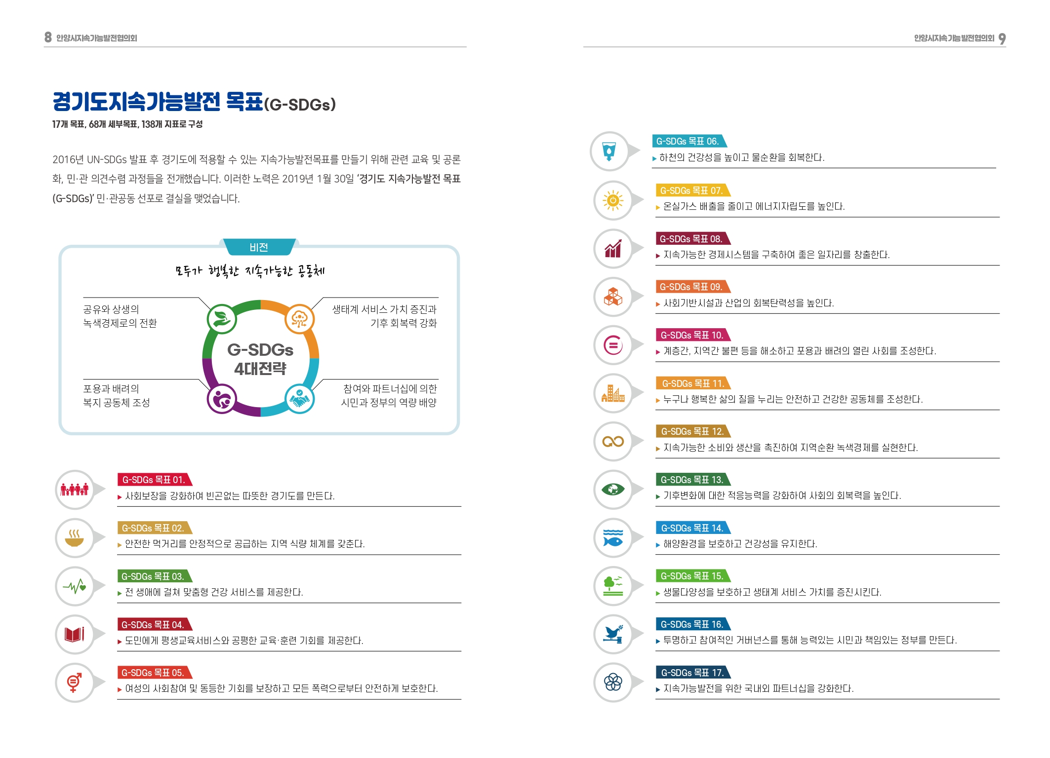 안양시는 지난해 12월 4일 향후 20년의 ‘지속 가능한 발전 기본전략 및 5년간의 추진계획 수립 용역’ 최종보고회를 통해 ‘현재세대와 미래세대가 함께 살아가는 지속가능한 안양’이라는 비전을 세우고 이를 기반으로 17개 목표, 48개 세부목표, 72개 지표, 88개 단위사업으로 구성된 지속가능발전 기본전략 및 추진계획을 수립했다.