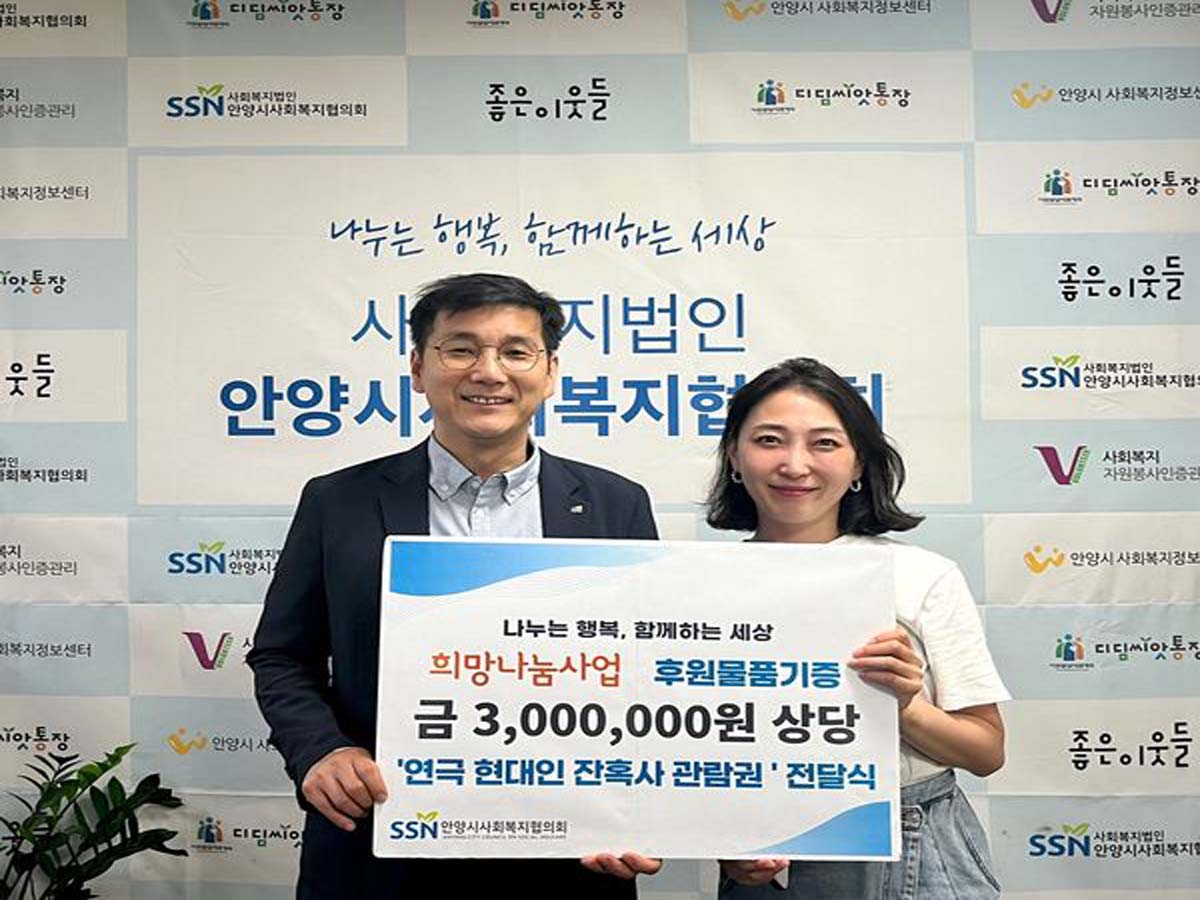 극단미스터리(대표 이목련)가 2024년 희망나눔사업 일환으로 안양시사회복지협의회(회장 도준우)에 300만원 상당의 「문화소외계층 및 종사자 등을 위한 연극 관람권」을 전달했다.