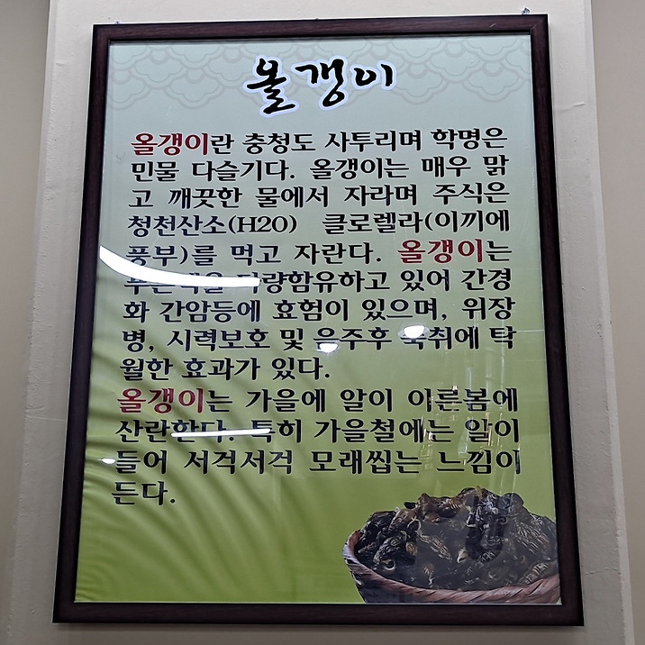 올갱이국은 최초의 해장국이다. 대부분의 해장국이 시원한 국물로 속을 풀어주기만 한다면 올갱이국은 숙취해소는 물론 간과 위에까지 좋다고 해서 술꾼들의 사랑을 한 몸에 받는다.
