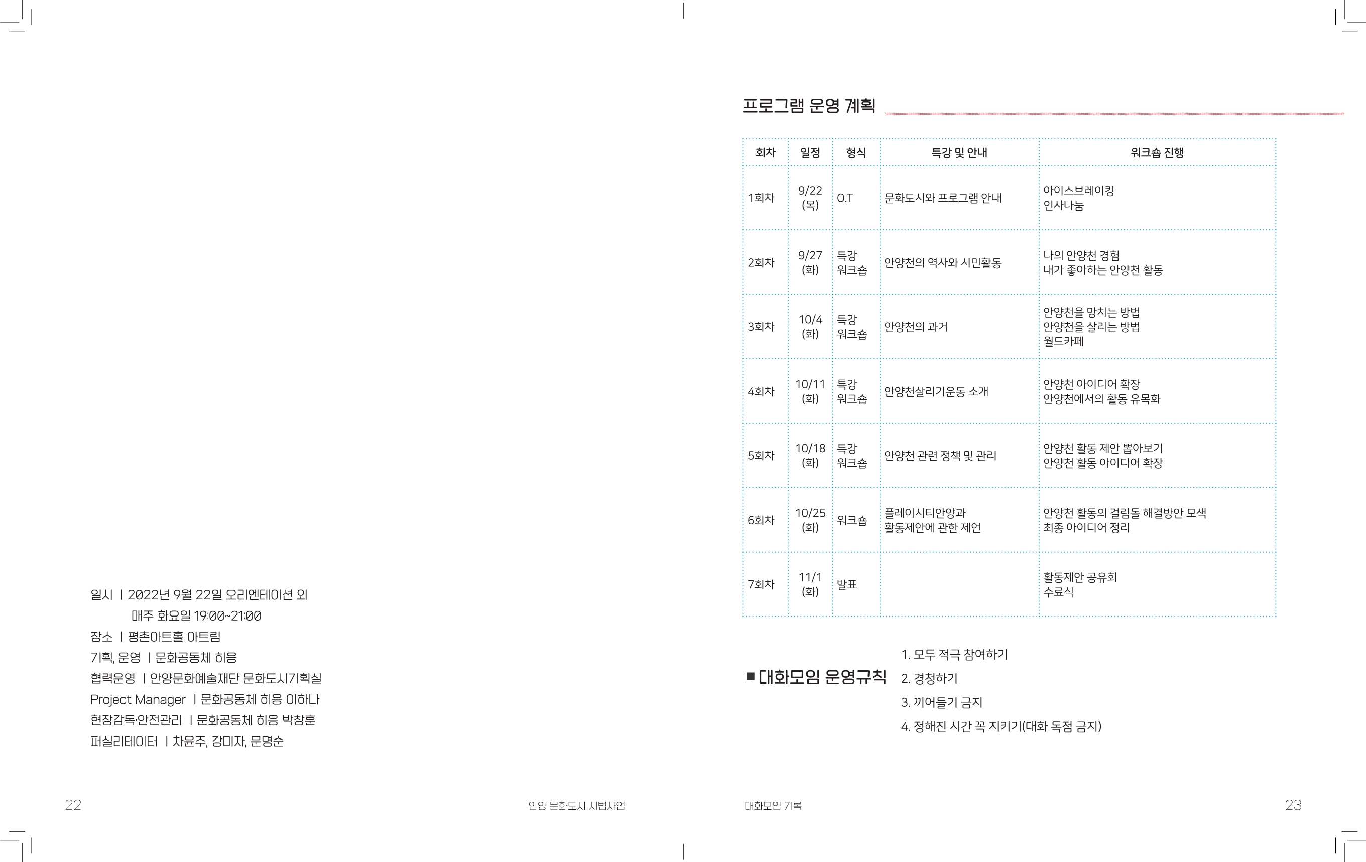 △안양천의 역사와 문화△수변 문화 활성화 사례 공유특강△안양천의 다양한 활동 조사 발표△활동 제안 워크숍 등 교육과 라운드테이블 형식으로 매주 화요일 오후7시부터 9시까지 평촌아트홀에서 진행했다.