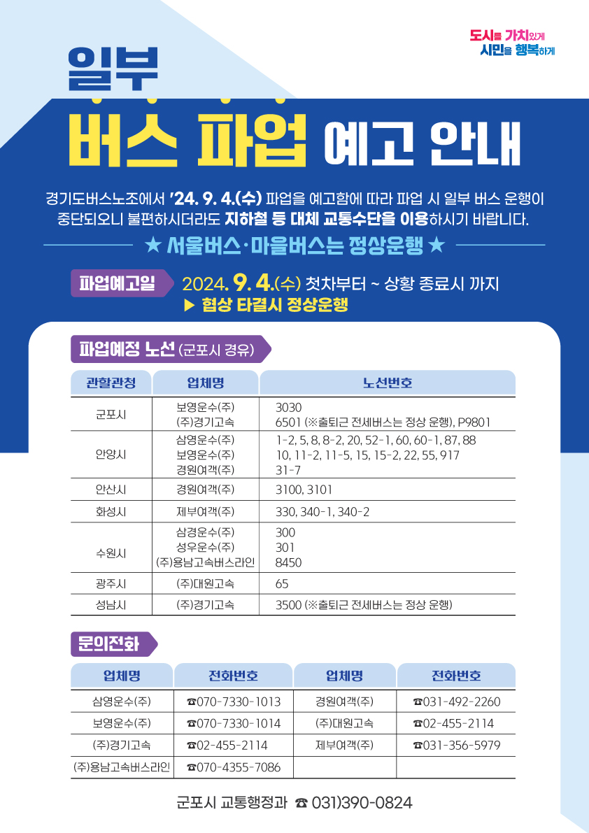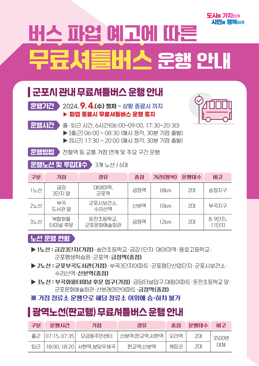 [군포시 파업예정 노선 및 무료셔틀버스 운행 안내]