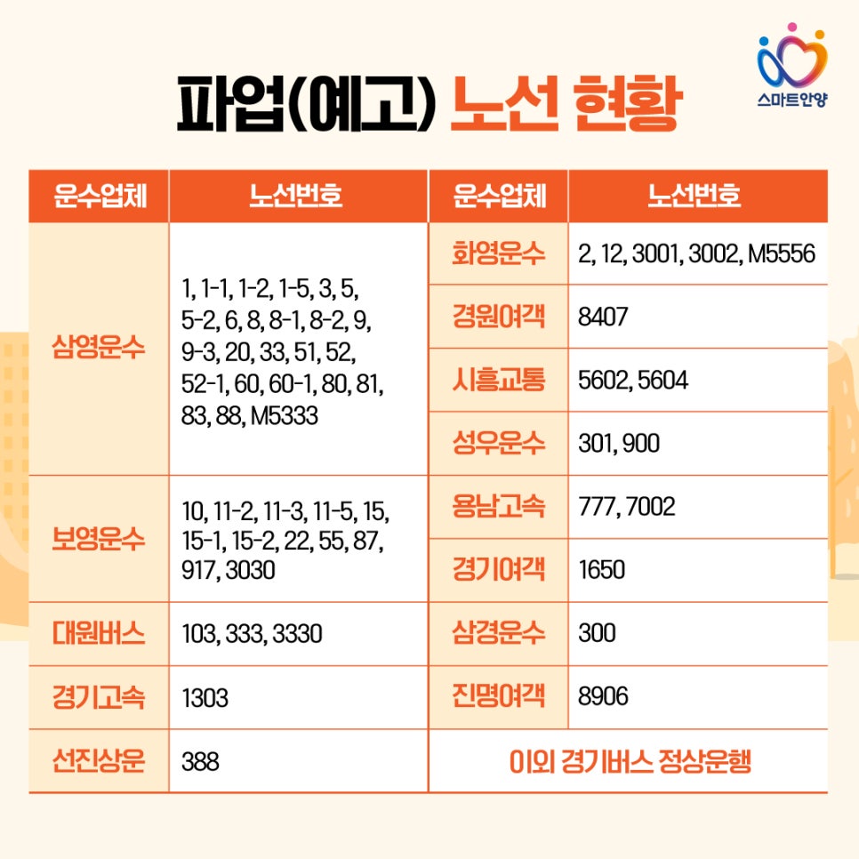 [안양시 파업예정 노선 및 무료셔틀버스 운행 안내]