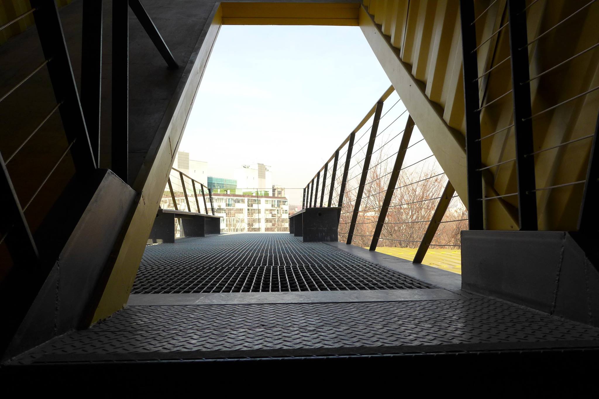 면적은 238㎡ 규모로 노란색 컨테이너 8개가 6개의 기둥위에 필로피 형식으로 지면에서 3m 올려져 조합된 판상의 구조물로 하천과 산책로, 공원부지에 연결되어 있다.