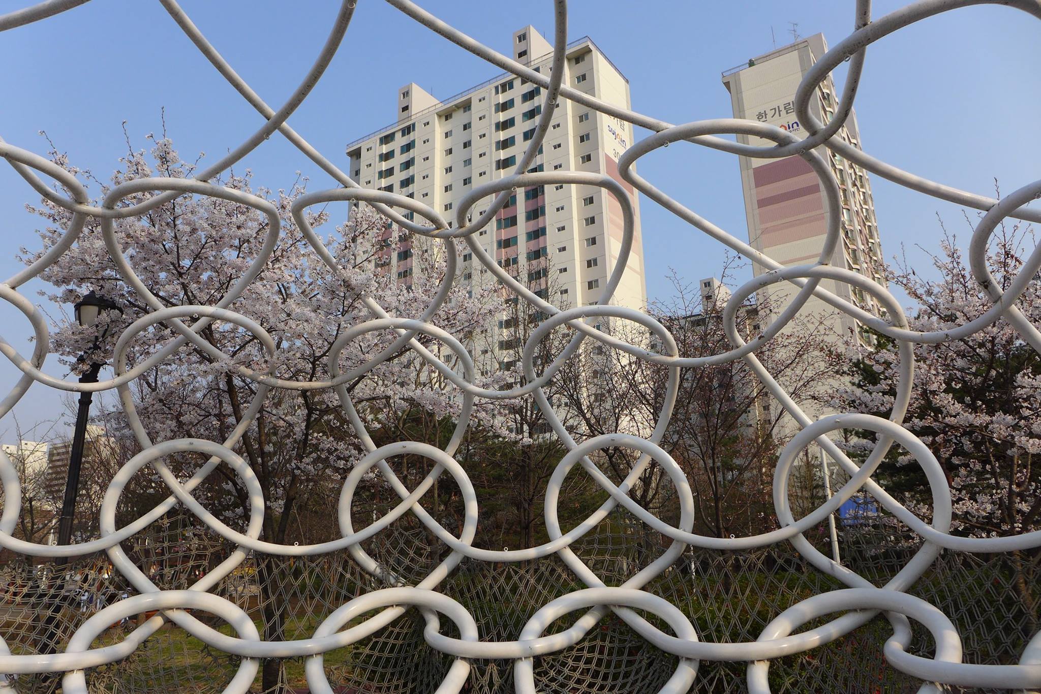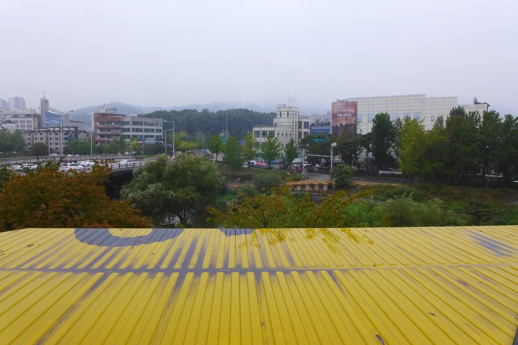 '오픈 스쿨' 뒤쪽으로는 아파트가 배경이며, 앞쪽으로는 맑은 물이 흐르는 학의천과 조화를 이룬다.