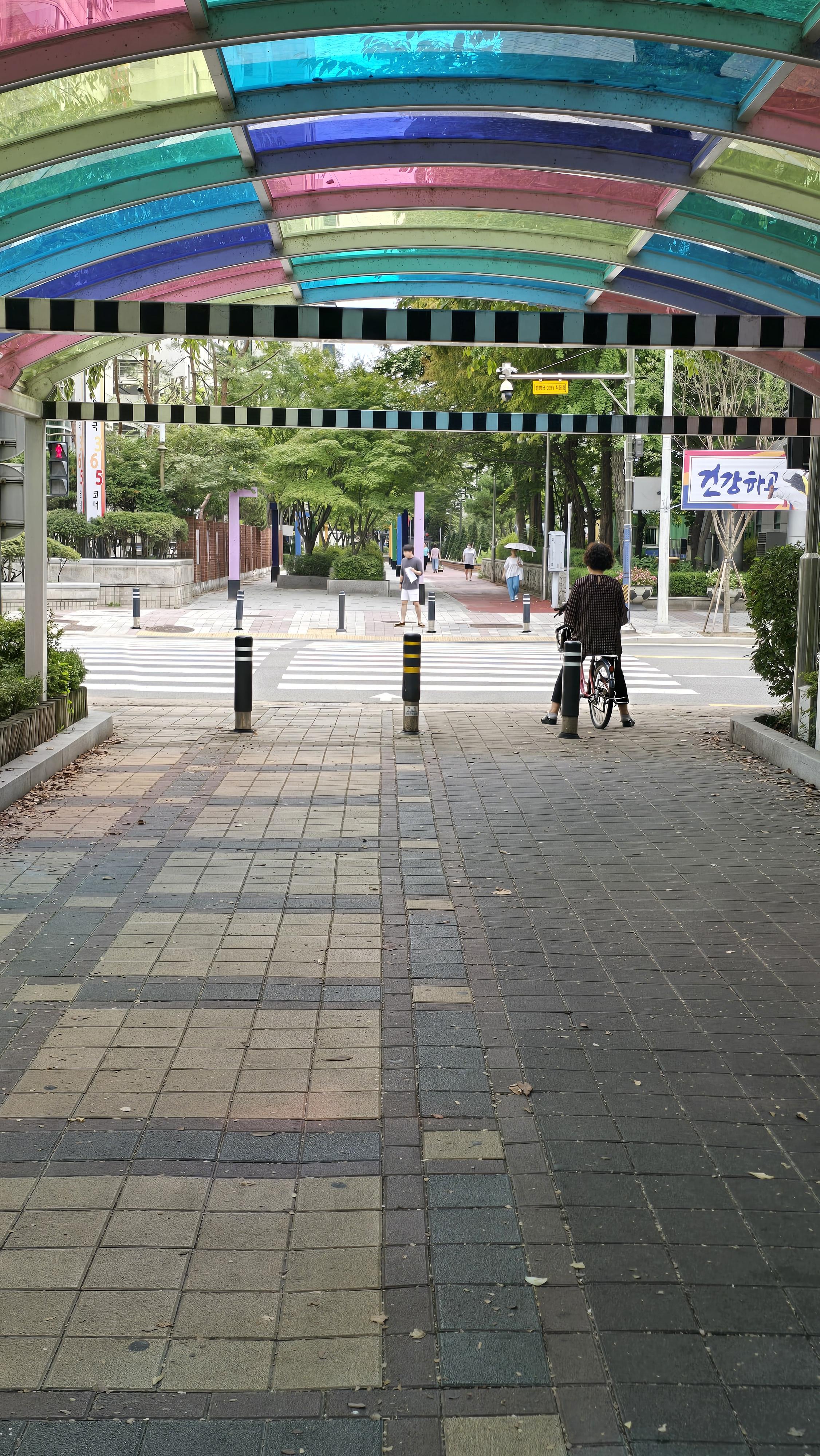 양쪽 기둥을 잇는 보에는 작가가 시각적 도구로 사용해온 검은색과 흰색이 교차하는 줄무늬가 있다. 다양한 색의 색유리로 지붕을 만들어 일 년 내내 선명한 색을 통행로에 비추는 것을 보며 주민분들이 여기를 지날 때마다 너무 행복할 것 같다는 생각했다.