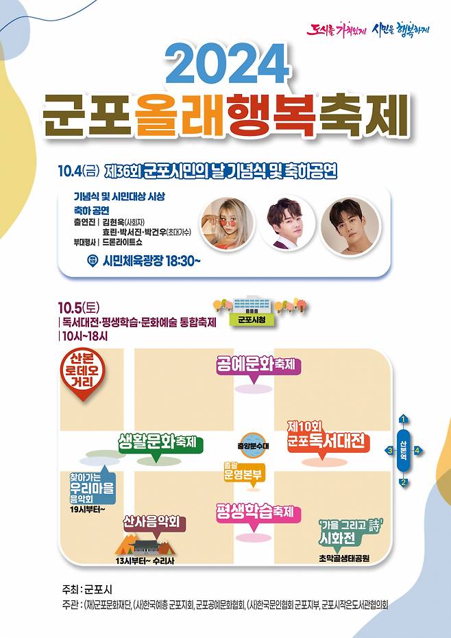 군포시가 주최하고 (재)군포문화재단, ㈔예총군포지회, ㈔문인협회 군포시지부, 군포공예문화협회, 군포시작은도서관협의회가 주관하는 2024 군포올래 행복축제가 펼쳐지기 때문이다.