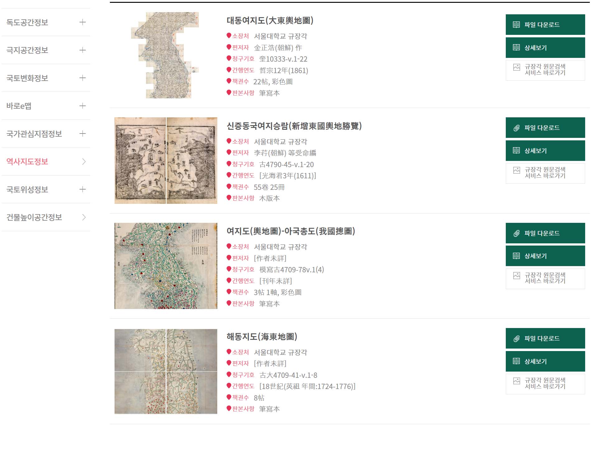 특히 역사지도 웹페이지에서는 대동여지도, 삼일운동지도, 종이지도 등을 25K. 50K, 250K로 축소 또는 확대해서 볼수 있다