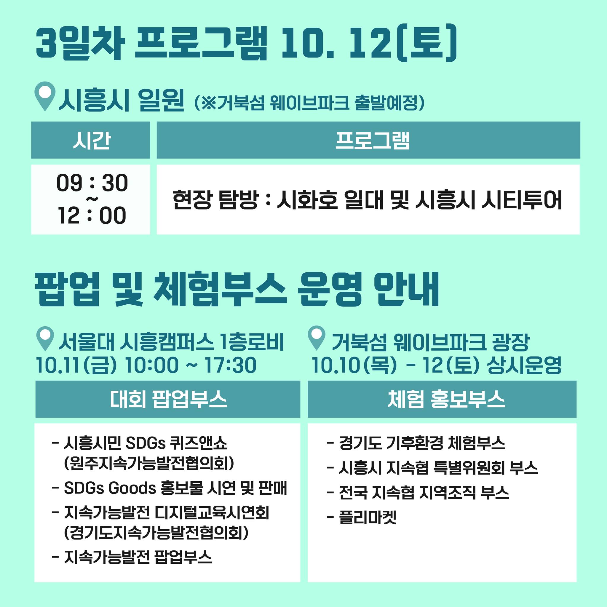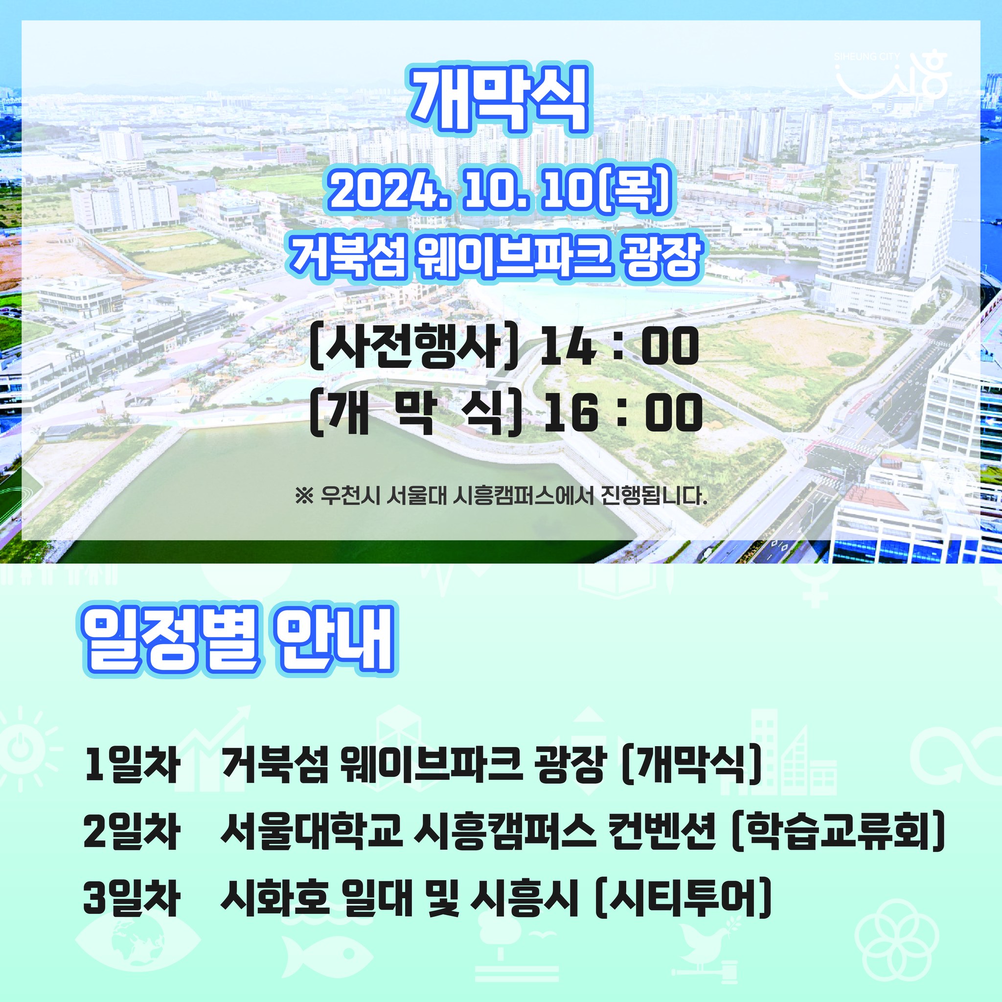 ‘2024 대한민국 지속가능발전대회’가 오는 10월 10일부터 12일까지 사흘간 시흥시 일대(거북섬 웨이브파크 광장, 서울대학교 시흥캠퍼스 등)에서 개최된다.