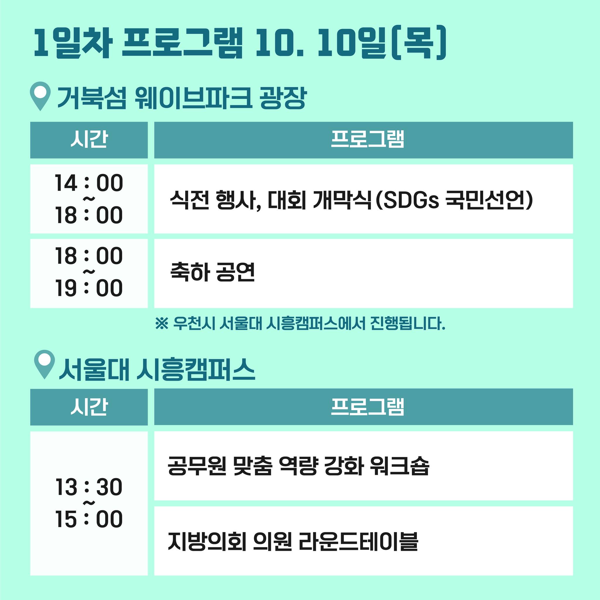 대회 일정을 살펴보면 ▲1일 차는 거북섬 웨이브파크 광장에서 시민참여 퍼포먼스, 우수사례 시상 등 기념행사가 ▲2일 차는 서울대학교 시흥캠퍼스에서 타운홀미팅, 포럼, 다양한 주제의 콘퍼런스 등 학술행사가 ▲3일 차는 시화호 일원의 생태탐방과 남녀노소 누구나 참여할 수 있는 체험ㆍ전시 부스 운영 등 다채로운 일정으로 진행된다.
