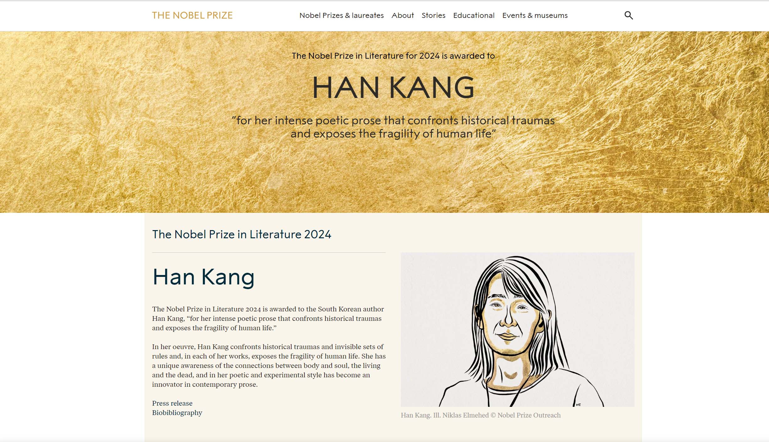 소설가 한강(53)이 한국 작가로 최초로 노벨 문학상 수상의 영예를 안았다.