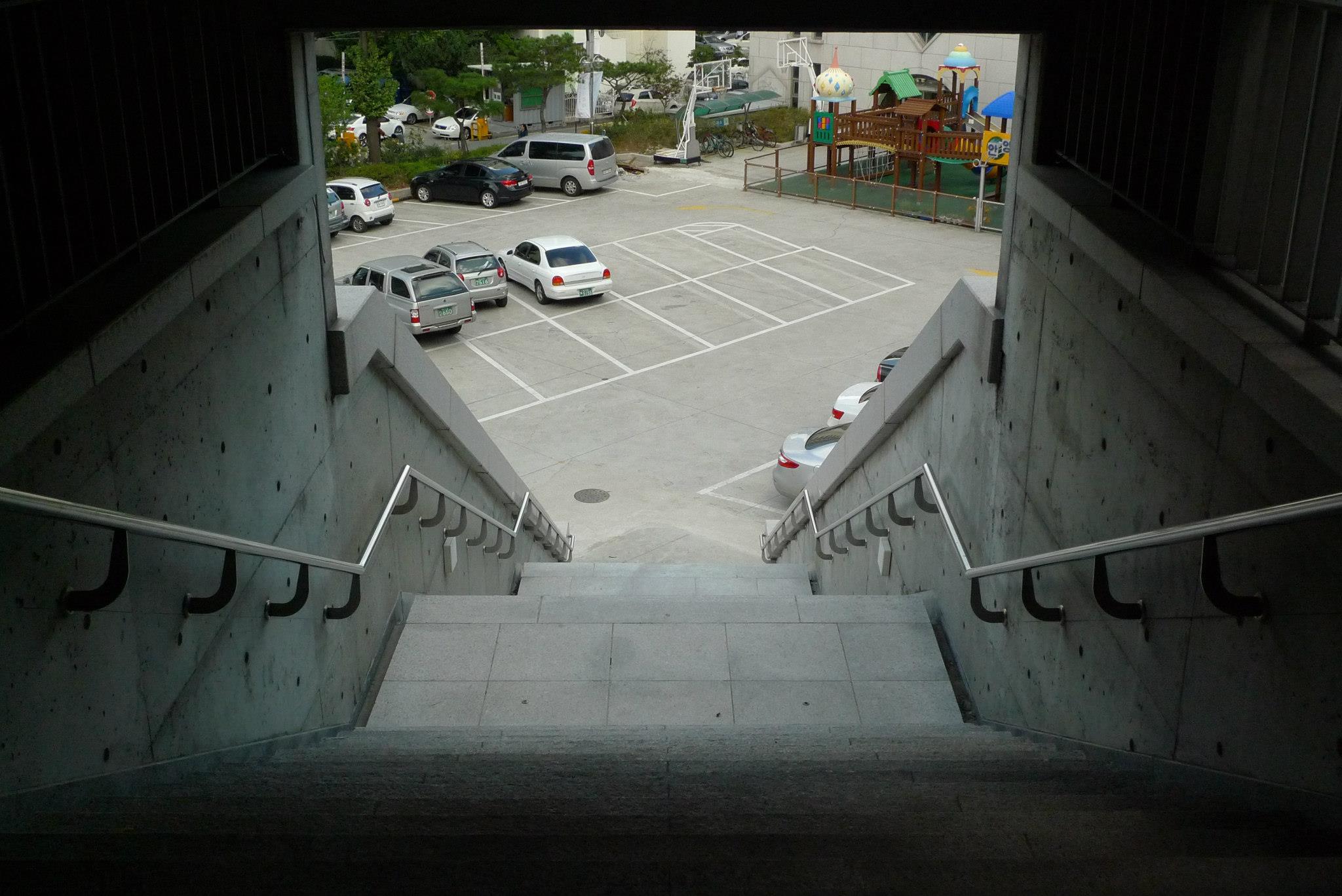 대지의 모순되는 여러 조건(30년 이상 시장점포가 이면도로 전부를 무단 점유하고 있는 관계로, 향과 주진입 등이 대지조건에 상반되는 불리함) 속에서 건물을 서향 배치하고, 동쪽으로 광장을 계획하였다.