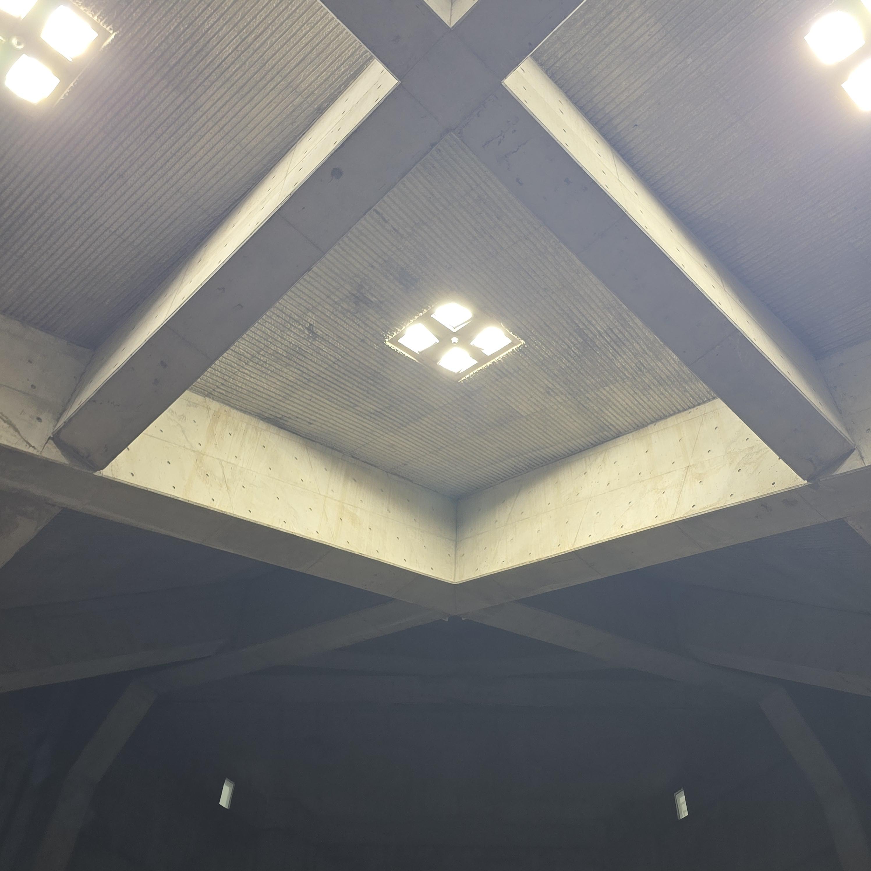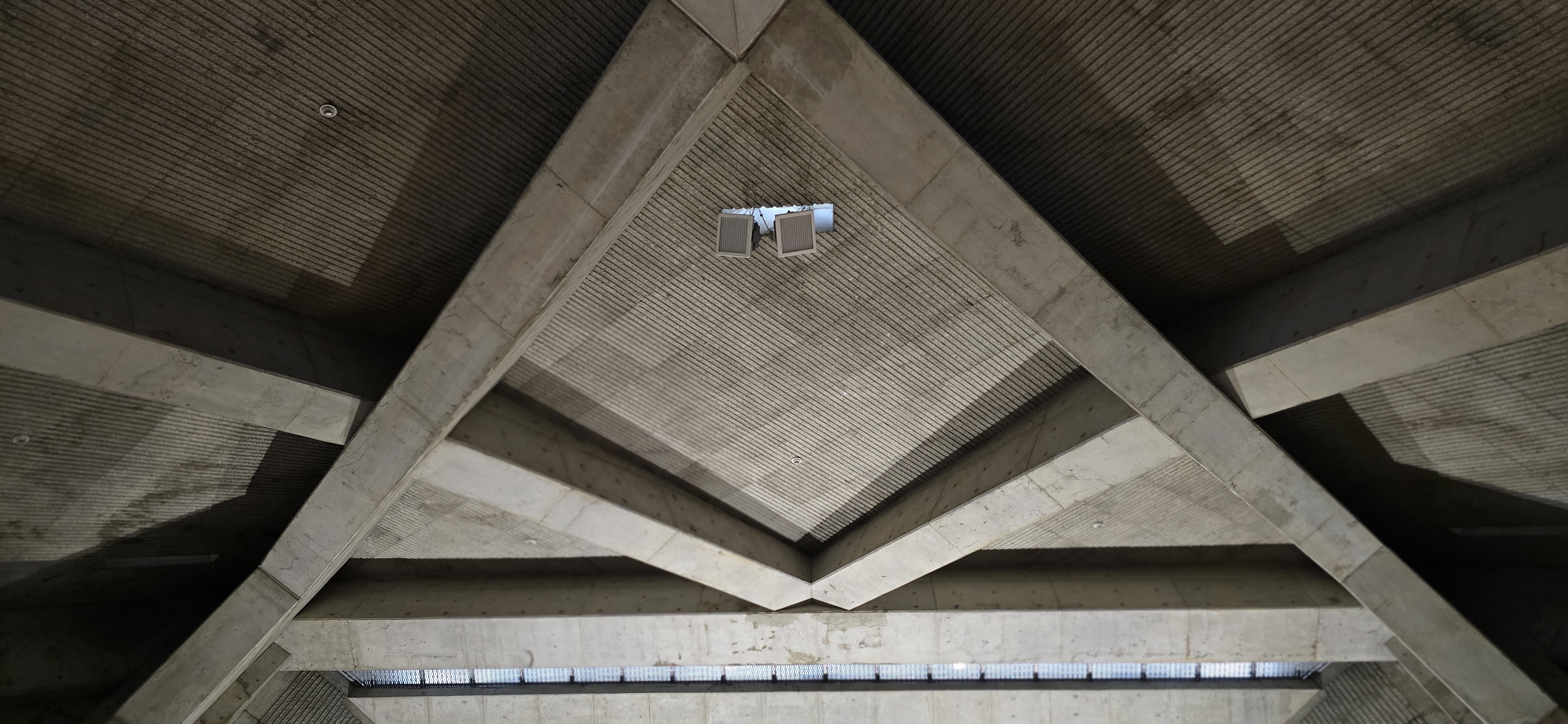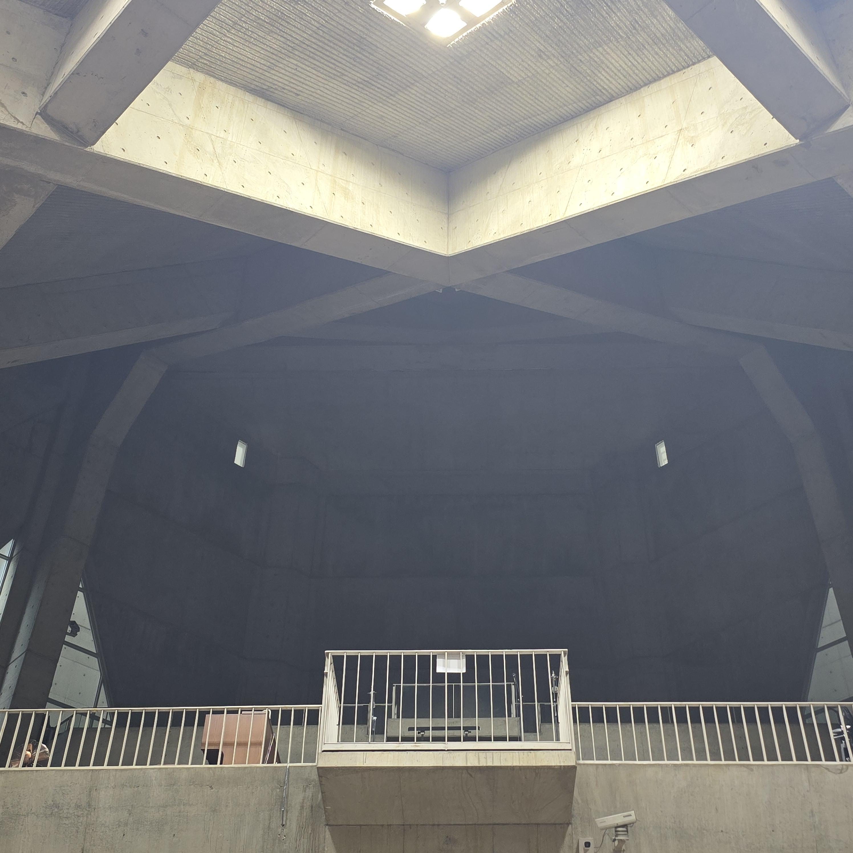 대각 교차선 네 개의 높이를 다르게 잡아 교차시킴으로 생기는 리지드 프레임(Rigid frame)을 선택하게 됨에따라 구조적 이점과 마름모형에 가까운 내부공간이 형성되어 음향 처리가 수월해지고, 외부는 자연스럽게 쌍곡포물선면(Hyper shell)이 형성되어 아름다운 지붕이 만들어지게 되었다.