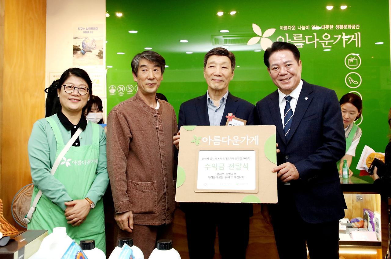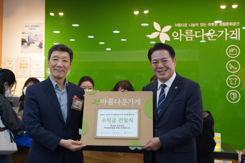 안양시 공무원들과 산하기관 임직원들이 기부물품을 모아 하루전 '공직자 아름다운가게 바자회'를 개최하면서 20주년 기념식에서 판매수익금을 전달하고 축하기념식을 가진것이다.