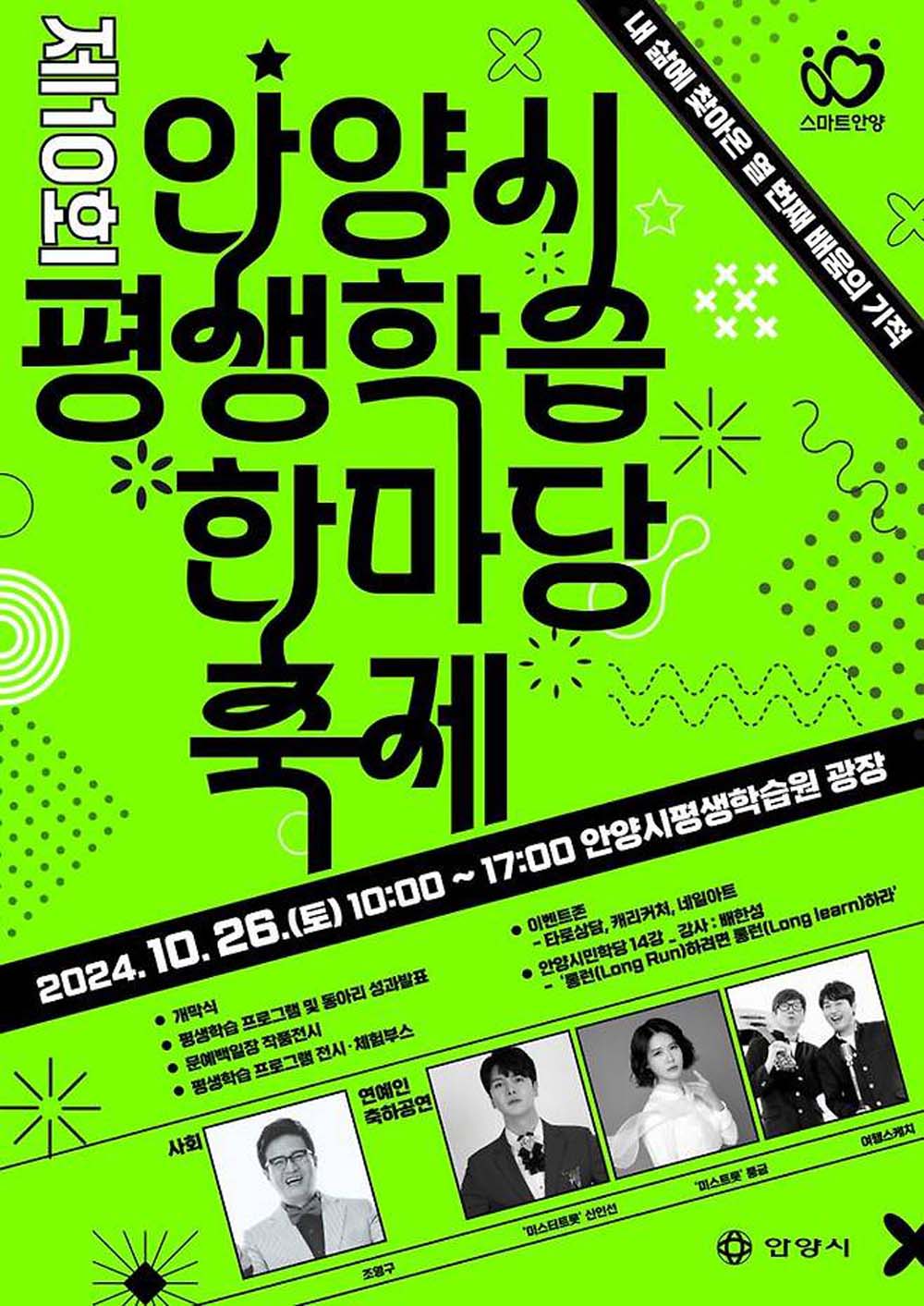 제10회 안양시 평생학습 한마당 축제는 '내 삶에 찾아온 열 번째 배움의 기적'을 주제로 관내 평생학습 기관 및 단체, 학습동아리가 함께 모여 평생학습의 성과를 공유하고 체험하며, 평생학습인과 시민이 함께 즐기고 화합하는 행사다.