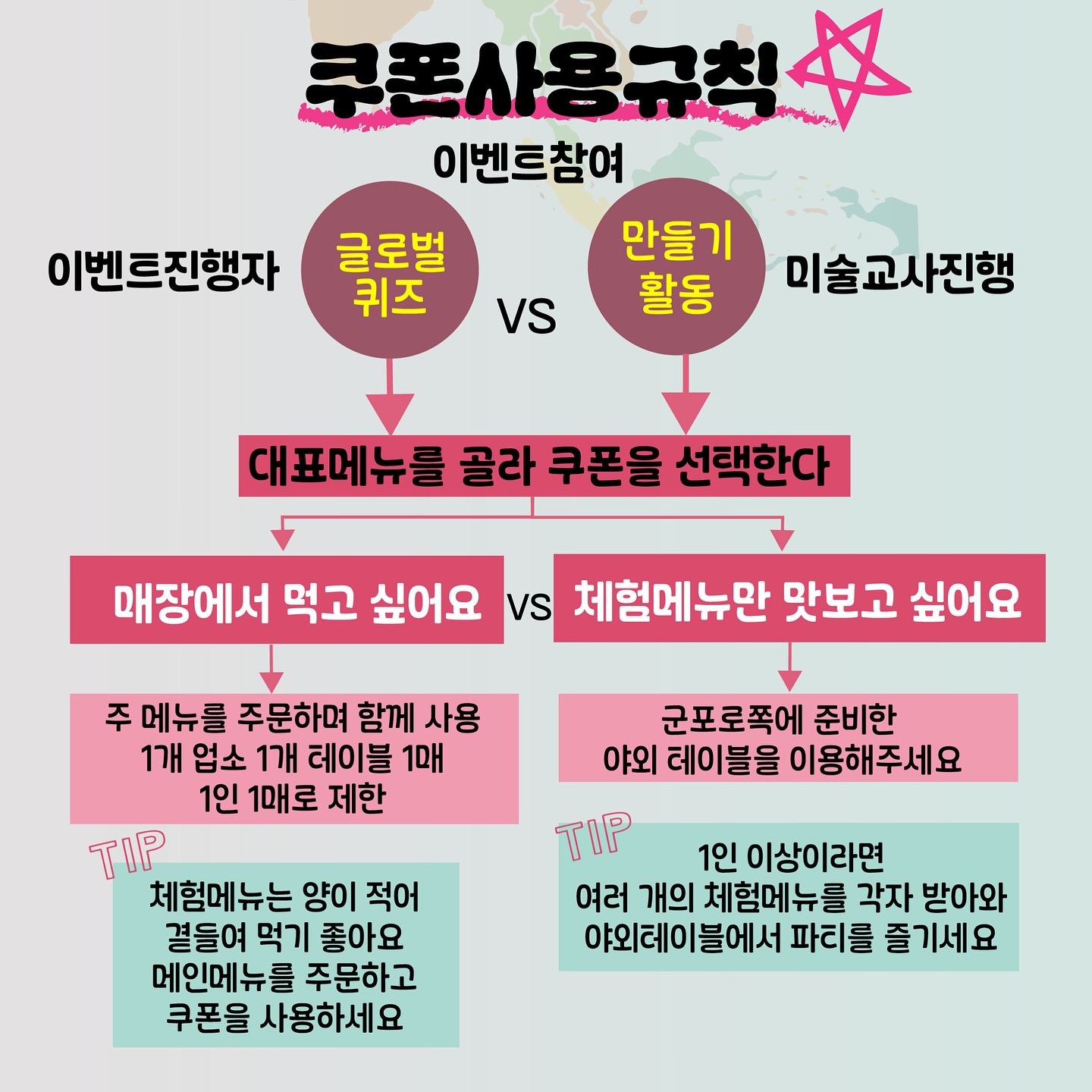 현장에서는 아시아에 대한 퀴즈이벤트에 참여하시면 5천원 상당의 #음식문화축제 #체험쿠폰 을 받으실 수 있어요. 체험쿠폰은 각 매장마다 사장님들이 특별히 추천한 맛배기 음식을 무료로 받으실 수 있는 체험권이다. 이 쿠폰은 다른 음식을 주문할때 함께 사용하면 가장 좋다. 다양한 음식을 곁들여 맛보도록 마련했다.