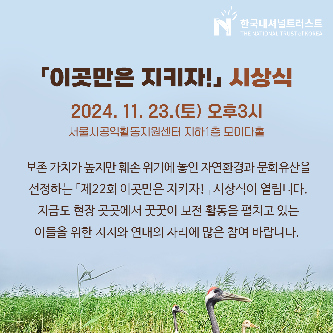 한국내셔널트러스트가 주최하고 환경부와 한국환경기자클럽이 후원하는 제22회 시민캠페인 '이곳만은 지키자!' 시민공모전 시상식이 11월 23일(토) 오후 3시, 서울시공익활동지원센터 지하 1층 ‘모이다홀’에서 개최된다