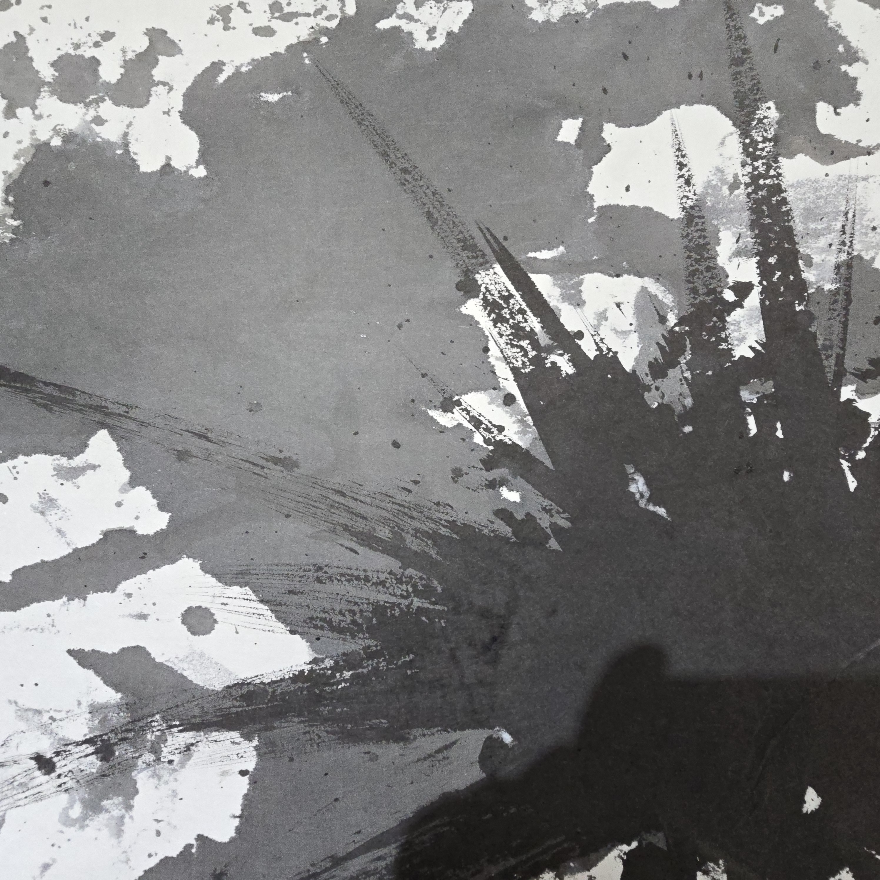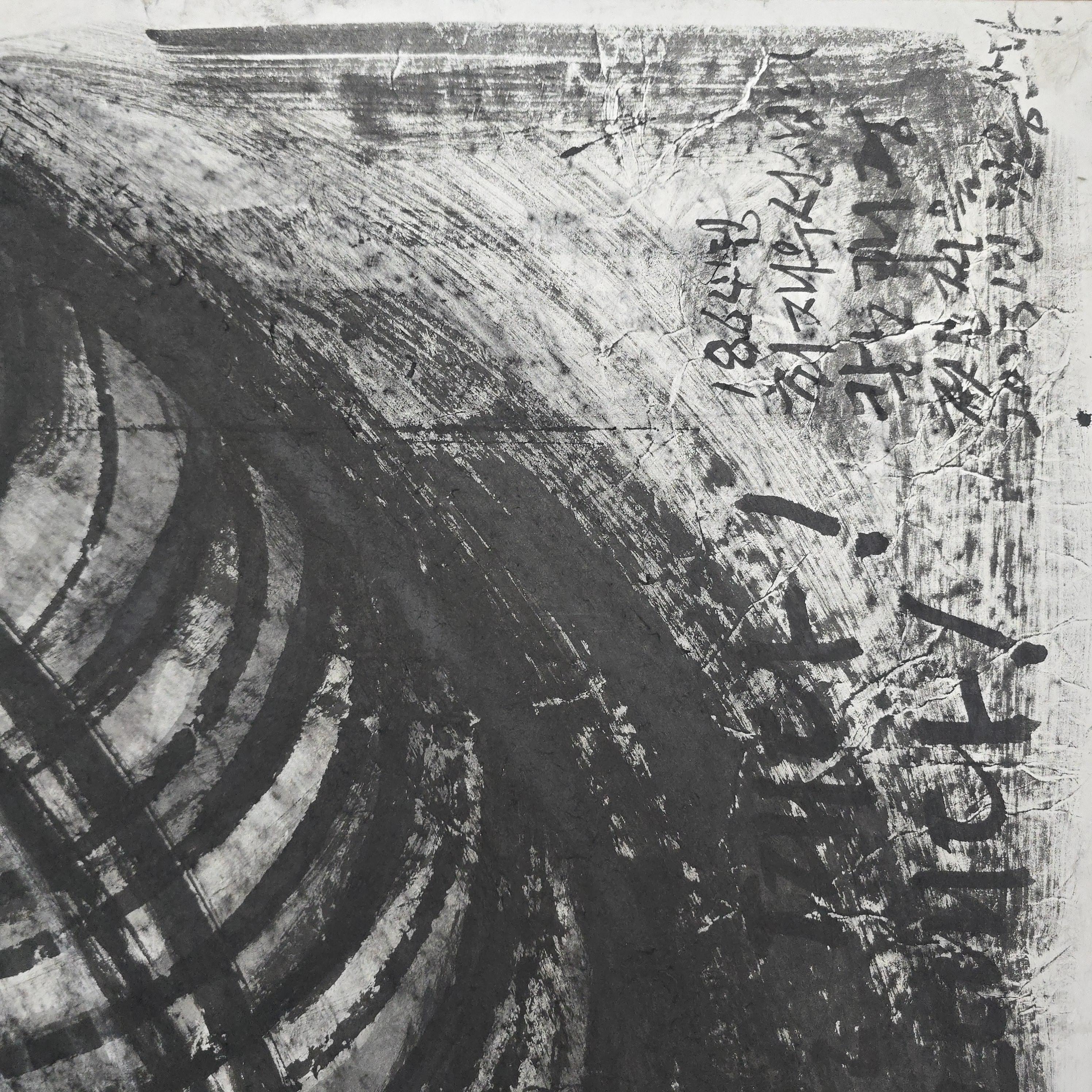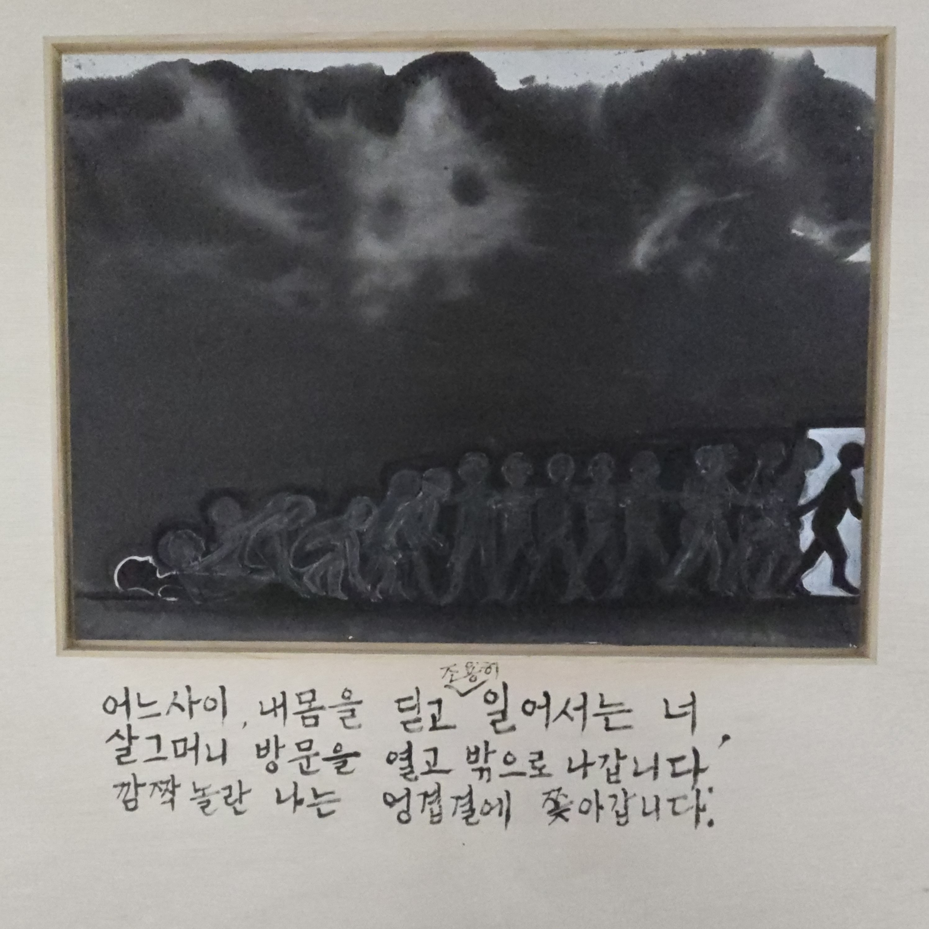 대표적인 작업이 <때무늬>(2024)다. 그는 어느 날 작업실 한쪽에서 오윤의 목판화 <칼 노래>를 떠 올리고는 그 간결하고 힘찬 선을 찾아 휘돌이 역사 무늬를 그려댔다. 거친 먹선은 마치 ‘암모나이트 화석’이나 ‘달팽이’ 모양을 하고 화면 중앙으로 말려 들어간다. 최제우의 시 <검결(劍訣)>을 불어로 번역해서 쓰고 휘돌이 무늬를 따라 한 해씩 연도를 적어 들어가 마침내 수운 최제우를 역도로 몰아 죽게 한 1864년에 도달한다. 그의 청년 시절 목판화는 그림 표현의 수단이기도 했고 그림책을 위한 명료하고 깨끗한 선화(線畫)의 매체가 되기도 했다. 그의 그림 구석구석에 나타나는 선명하고 깔끔한 굵은 선들은 이 시절 목판화에서 보았던 것들이다. 화면 위에 휘적이는 몸동작은 오윤의 <칼 노래>를 거쳐 최제우의 <검결>을 불러내고서야 멈춰 선다.