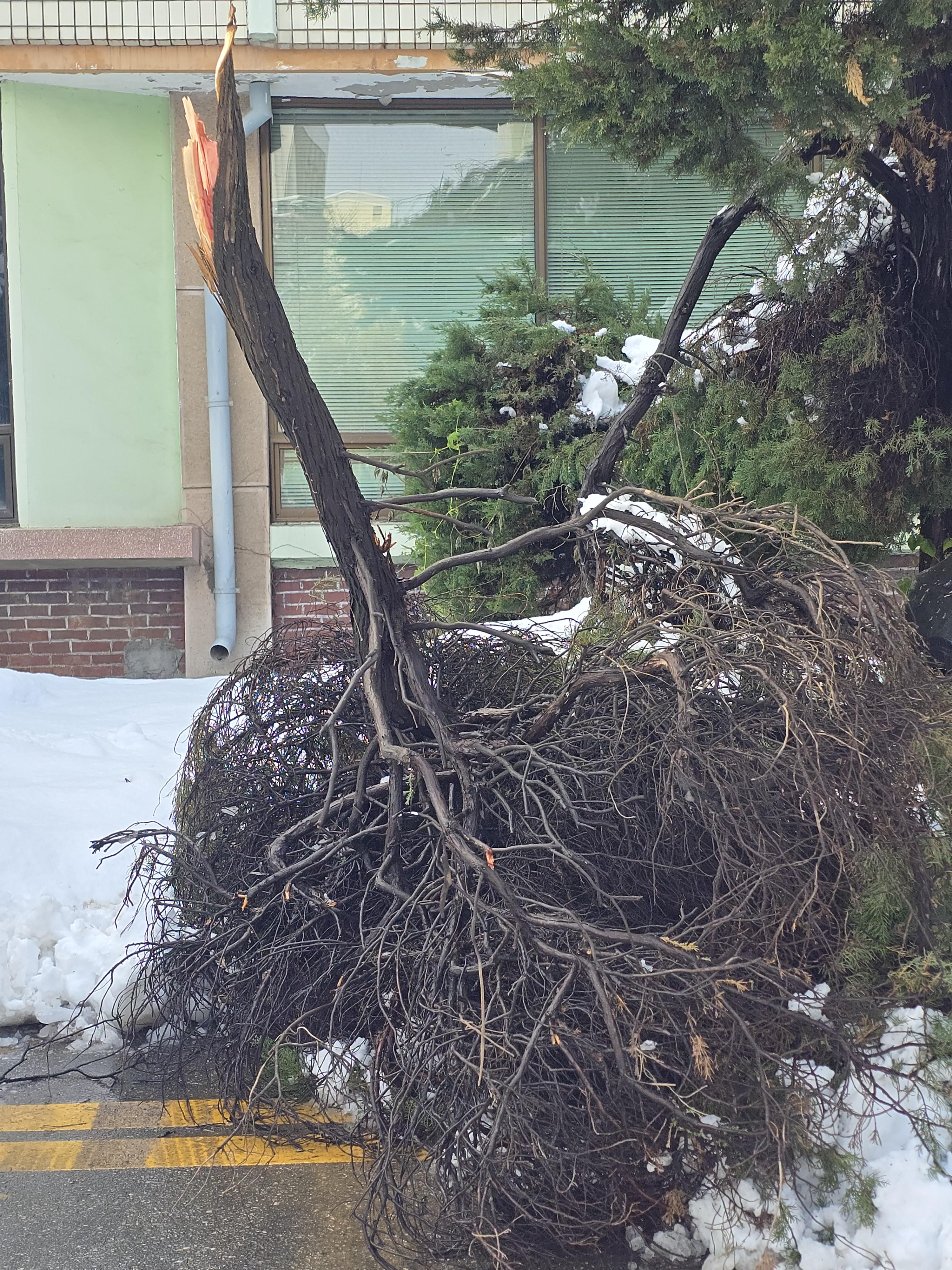 눈 무게가 얼마나 무거웠으면 맥없이 처참하게 쓰러졌을까? 기후변화로 잎을 떨구지 못한 나무에 큰 눈이 내리면서 하중이 더 커진 것으로 보인다. 이제 일년 사계절이 위험한 상황이다.
