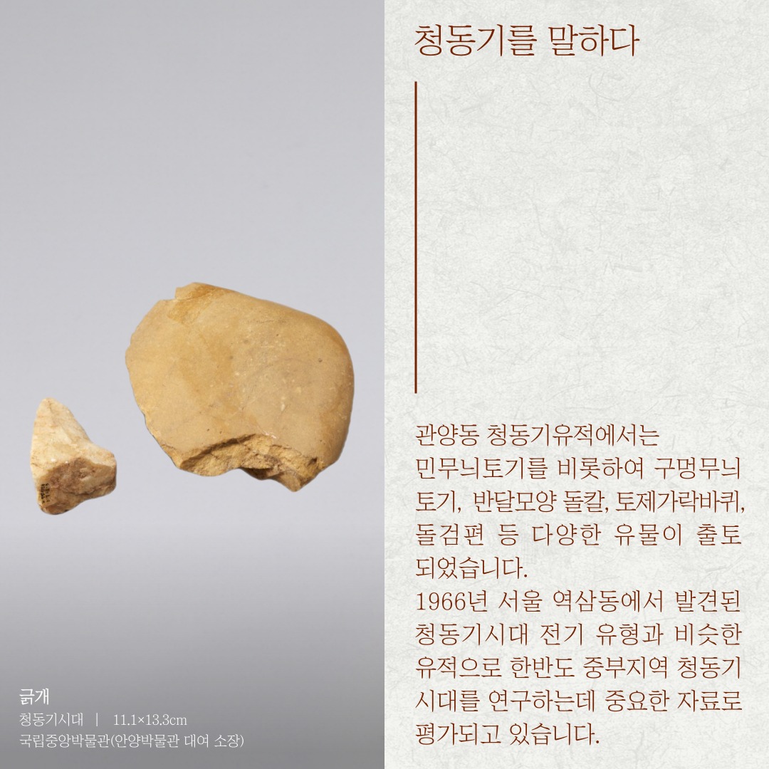 선사시대부터 '안양'에 사람들이 거주했다는 사실을 확인 할 수 있는 유물이자, 한반도 중부지역 청동기시대를 연구하는데 중요한 자료로 평가되고 있습니다.