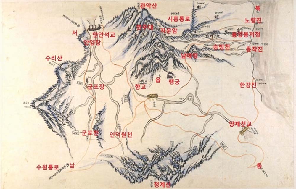 한강을 건너 수원으로 향했던 두 갈래 길이 보인다. 관악산 서쪽을 지나는 길은 시흥통로이다. 만안석교를 지나는 길이다. 또 다른 길은 남태령을 넘어 과천행궁을 지난다.