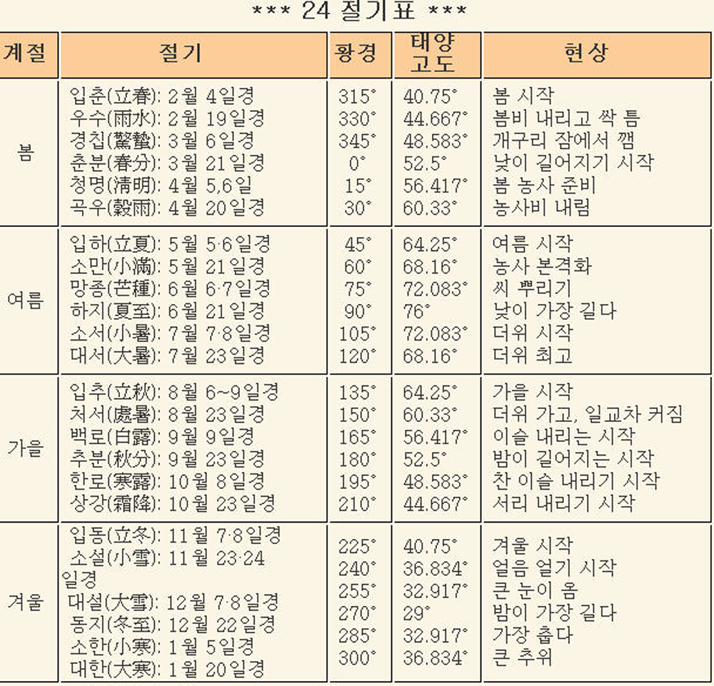 이 황경이 0°일 때를 춘분, 15°일 때를 청명(淸明) 등으로 구분하는데, 〈표〉와 같이 15° 간격으로 24개 절기의 날짜가 구분된다.