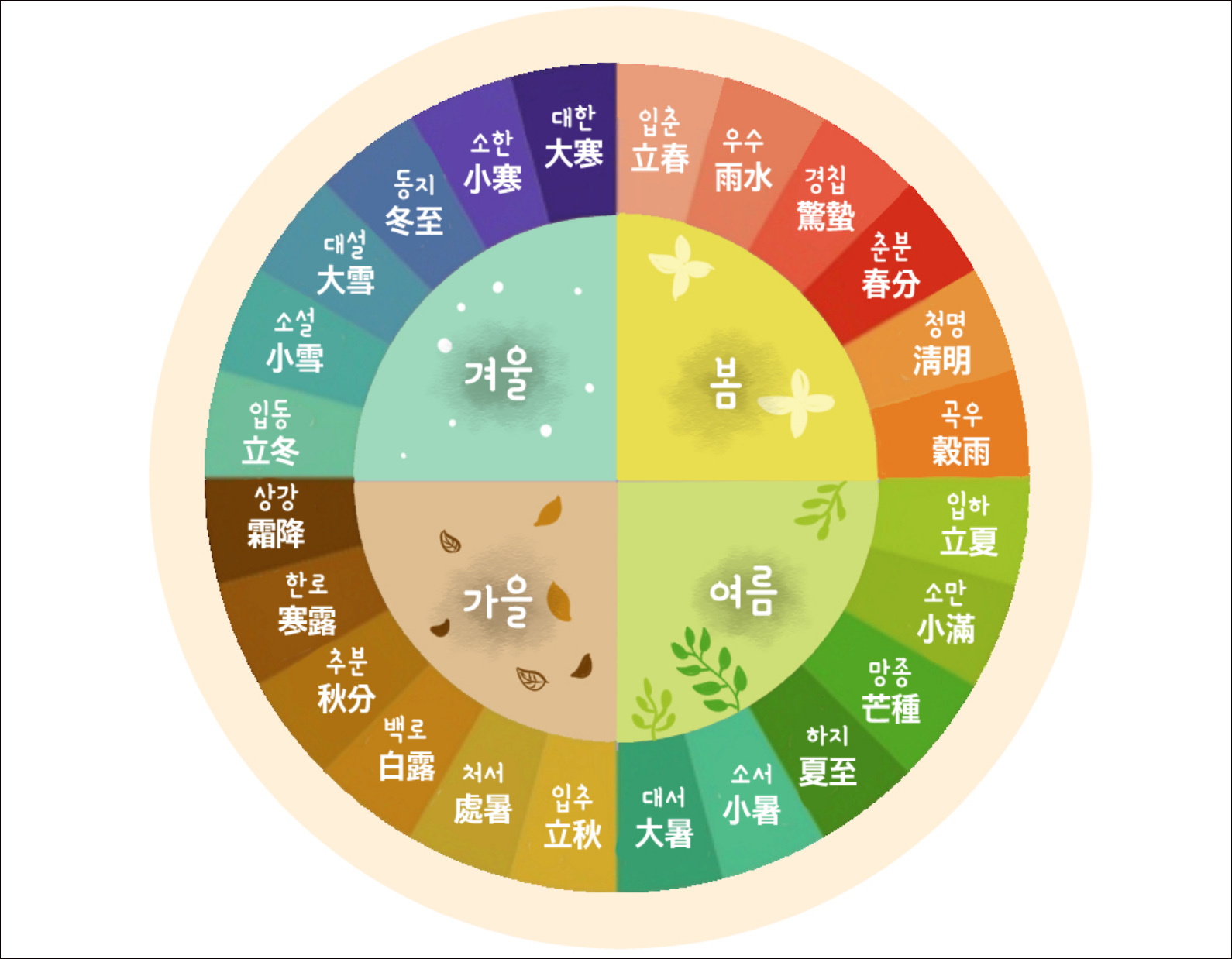 흔히 옛날에는 달의 움직임을 바탕으로 하는 음력을 사용했기 때문에 24절기도 당연히 달의 움직임에 따라 정해졌다고 생각하는 사람이 종종 있다. 하지만 24절기는 달이 아니라 태양의 위치를 바탕으로 만들어진 것이다. 그리고 봄에서 겨울까지 계절마다 각각 6개씩 있어요. 24절기는 다음과 같다.