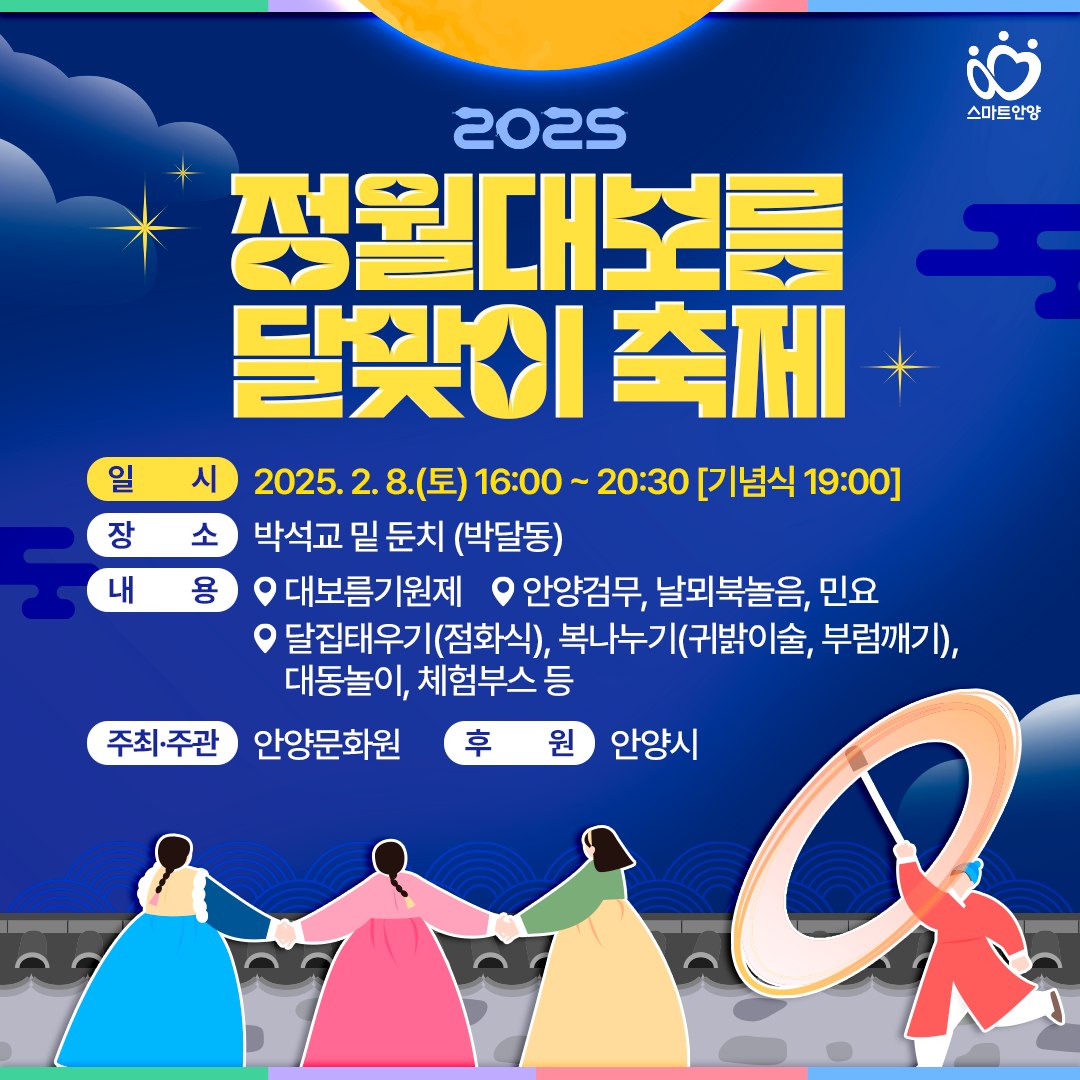정월대보름을 맞아 여러분과 함께 따뜻한 전통을 나누고, 새해 안녕과 풍요를 기원하는 정월대보름 달맞이축제가 2월 8일 오후 4시부터 안양천 박석교빝 둔치에서 안양검무, 날뫼북놀음, 안양민요보존회 공연과 함께 열린다.