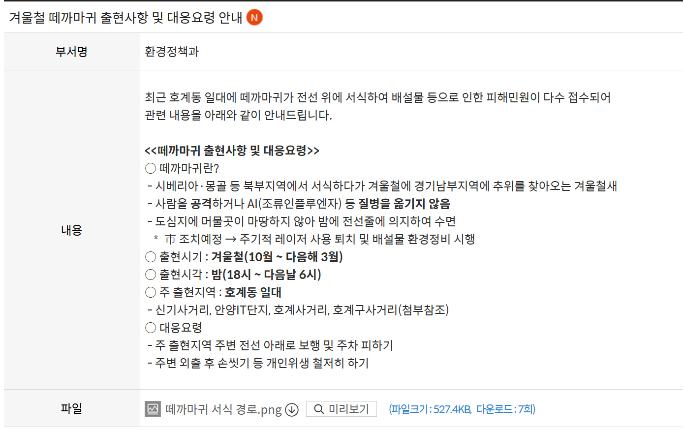 최근 안양 호계동 일원에 떼까마귀가 나타나기 시작하면서 각종 민원이 접수함에 따라 안양시도 비상이 걸렸다.