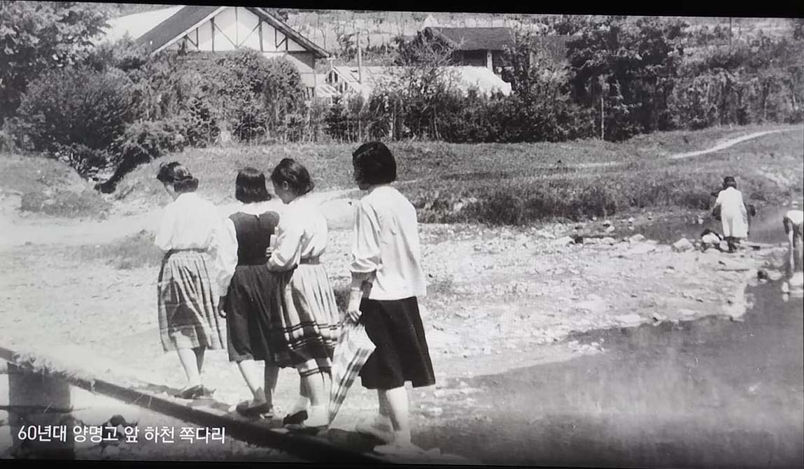 2024/02.11/ #아카이브 #옛사진 #기록 #기억 #안양 #since1960/ 안양박물관에서 VTR로 방영하던 안양의 옛모습 영상중 한컷으로 1960년대 안양2동으로 망해암과 안양풀 가기위해 안양천을 건너던 지름길인 나무다리와 뒤로는 별장같은 건물이 자리한 삼영농장(현 대우아파트)이 엿보인다. 사진속 당시는 양명고와 양명여고가 자리하기 이전으로 나무다리를 건너 좌측은 안양기독보육원(현 좋은집), 우측으로는 삼영농장이 있었으며 쪽다리를 건너 보육원과 농장 가운데 사잇길을 지나 쭉 가면 망해암 올라가는 산길이다. 당시는 망해암 뒷산(현 비봉산)을 깍아 개설한 경수산업도로가 생기기 전이다. 1970년대 경수산업도로(현 1번국도)가 놓여지면서 산 끝자락에 있던 삼영농장과 안양기독보육원 땅이 많이 훼손됐다.