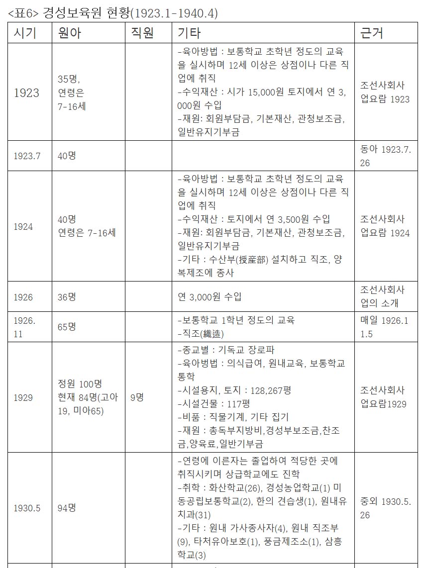 각종 자료에 보이는 경성보육원의 현황을 정리하면 <표6>과 같다.