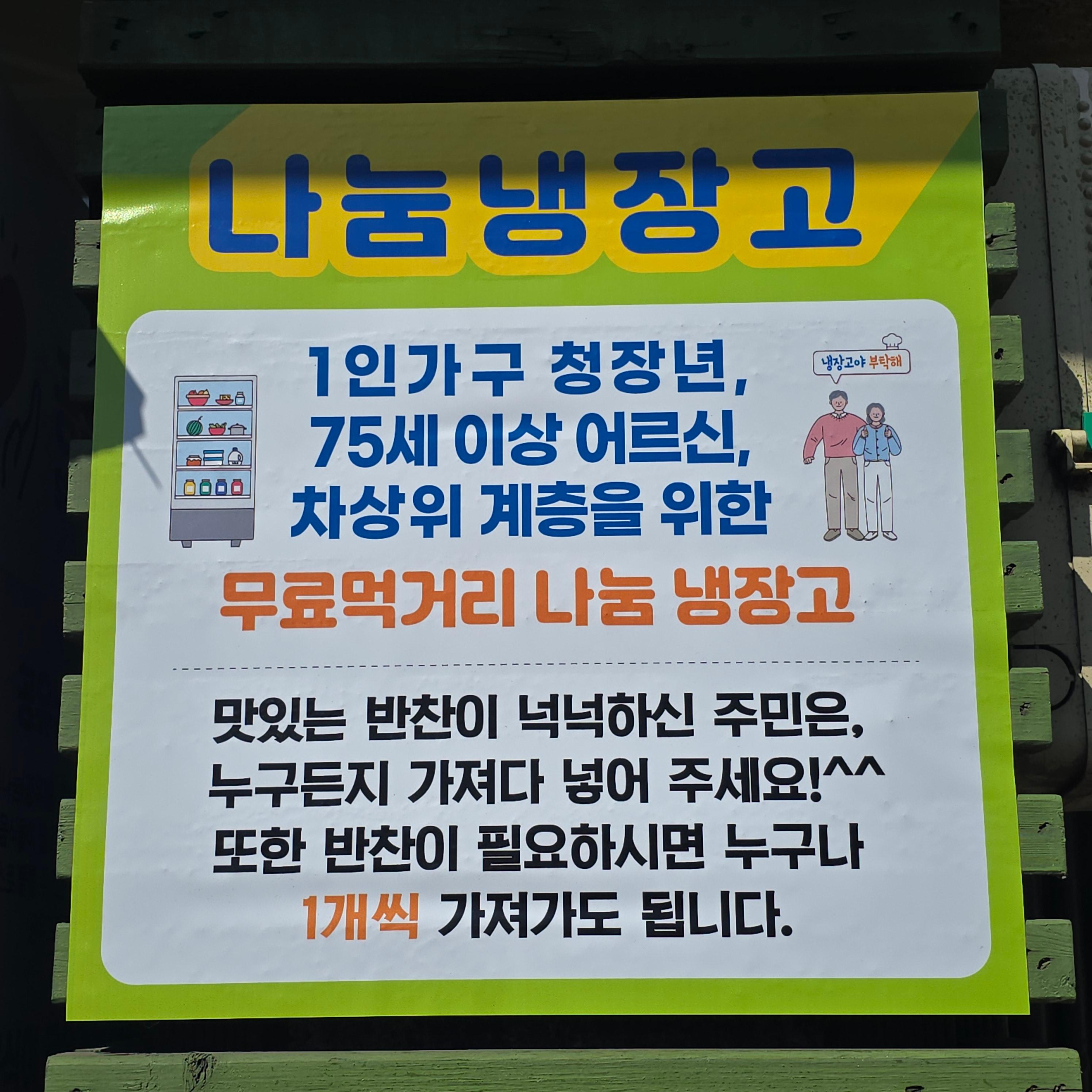 '공유냉장고'는 누구나 음식을 냉장고에 채워 놓을 수 있고 음식이 필요한 사람은 가져갈 수 있는 모두의 냉장고로 이웃과 나눔, 돌봄, 공유의 가치를 실천하고 잉여 먹거리를 줄여 환경을 지키는 일에도 기여한다. 특히 주민들이 따뜻한 정을 기반으로 서로 교류하고 소통하며 위안을 얻는 ‘우리동네 사랑 나눔 공유 프로젝트’이다.
