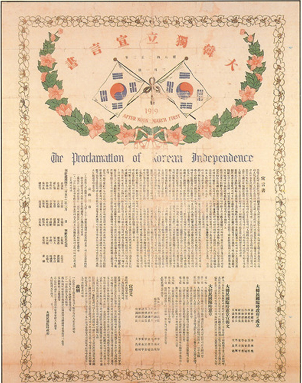一. 今日(금일) 吾人(오인)의 此擧(차거)는 正義(정의), 人道(인도), 生存(생존), 尊榮(존영)을 爲(위)하는 民族的(민족적) 要求(요구)ㅣ니, 오즉 自由的(자유적) 精神(정신)을 發揮(발휘)할 것이오, 결코 排他的(배타적) 感情(감정)으로 逸走(일주)하지 말라.