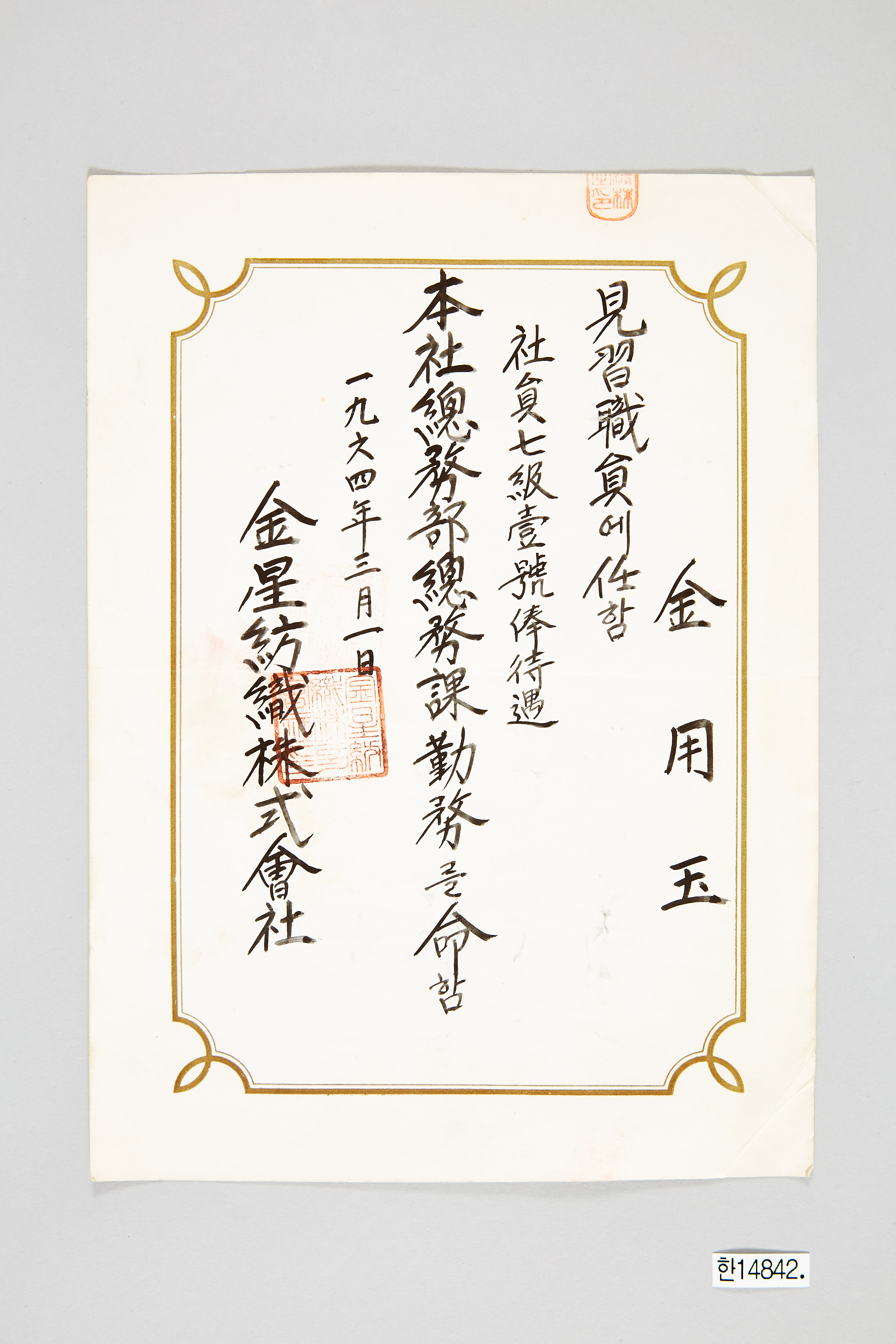 명칭: 금성방직주식회사 임명장(金星紡織株式會社 任命狀)