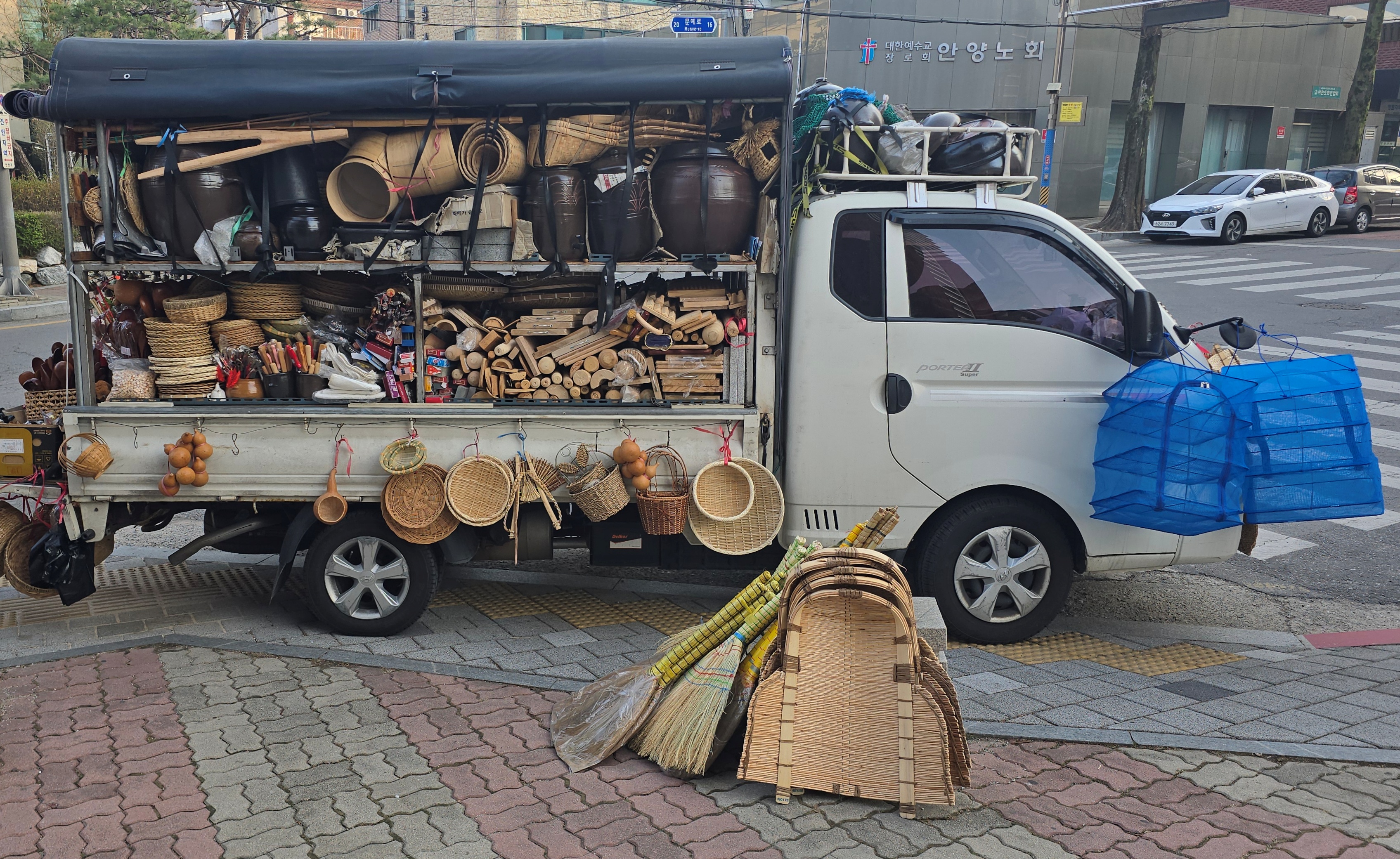 2025.03.12/ #도시기록 #안양 #동네 #골목 #만물상트럭/ 안양6동 골목에서 오랜만에 다시 만난 만물상트럭 아저씨. 전국을 누비다 오랫만에 왔다고 하네요. "언제 다시 오세요" 질문하니 정해진 날은 없고 50여일후 쯤 올듯 싶다고 하네요. 트럭에 빗자루, 주걱, 식칼, 항아리, 골동품 등 다양한 물건들이 진열된 자체가 눈길을 사로잡는 그림이지요. 어떤 물건이 있나 구경하는 것만으로도 재미가 쏠쏠합니다.