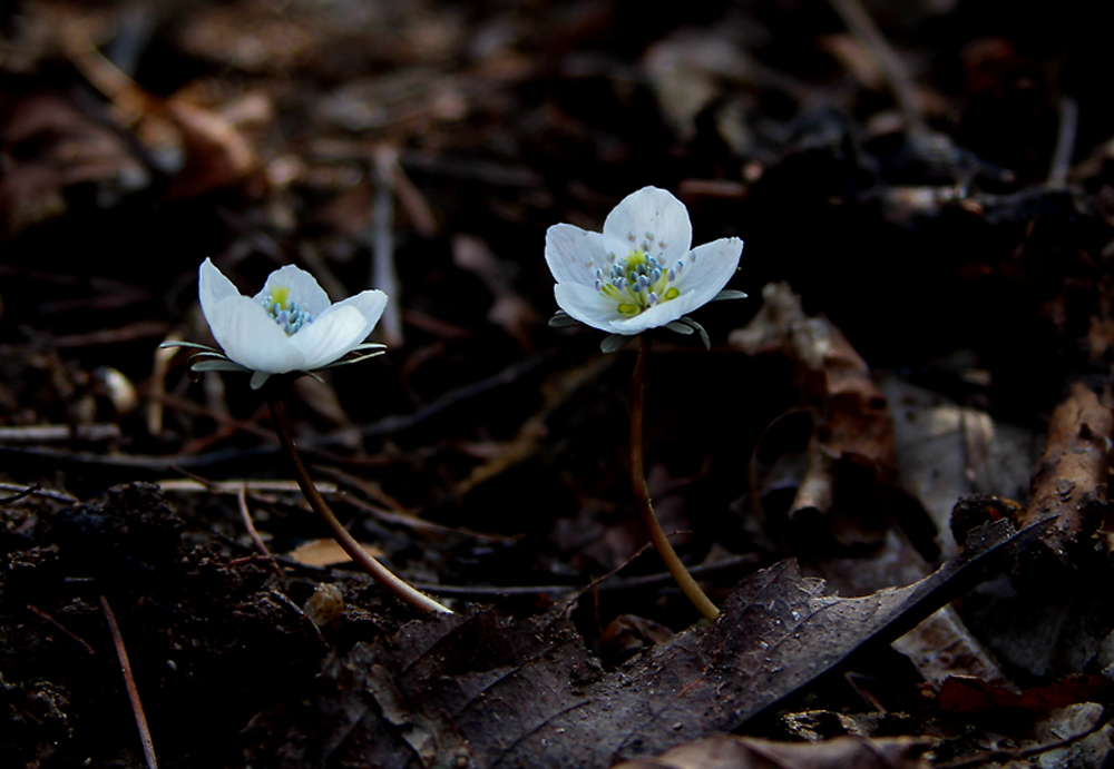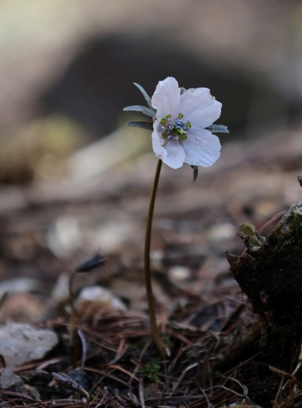 그럼 진짜 잎은 언제 볼 수 있을까요? 꽃이 질 무렵부터 땅속에서 나옵니다. 흔히 그것을 뿌리 잎이라고 부릅니다. 이른 봄에 피는 꽃들의 많은 경우가 꽃이 피고 잎이 나중에 피는 것을 보면 변산바람꽃도 그런 종류구나 하는 것을 알 수 있을 것입니다. 그럼 왜 힘들게 굳이 꽃을 따뜻한 봄날보다 추운 시기에 피울까요? 그것은 가루받이와 관련이 있답니다. 남들보다 좀 춥더라도 꽃을 일찍 피우면 가루받이 해줄 곤충들을 선점하고 독점할 수 있기 때문이랍니다. 잎없이 꽃을 피우기 위한 양분은 땅속에 덩이줄기로 비축해 놓았으니 그것을 밑바탕으로 쑥 꽃을 올려내고 있답니다.